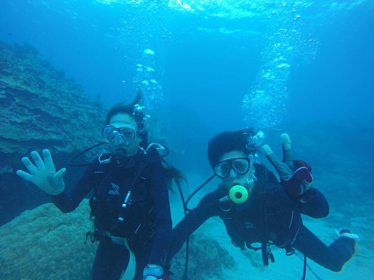 人生初のダイビング!台風が近づいていることもあり海は少し荒れていましたが、水深を深めていくごとに落ち着きお魚もたくさんいました。本当に楽しい体験になりました。