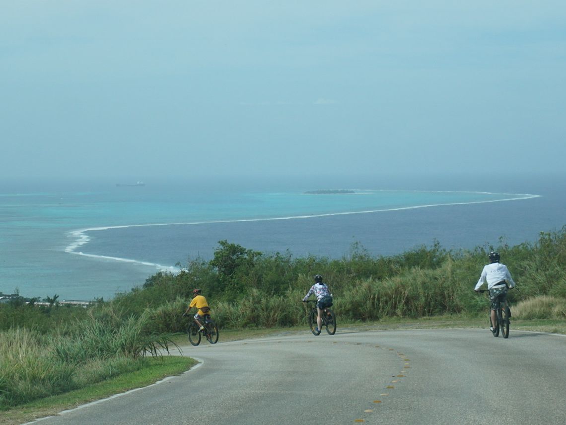 ピックアップタイムにお迎えが来ず、ホテルのフロントに確認してもらうと、どうやら予約が入っていなかった模様…その後、3分ほどでゴルフカートに乗ったガイドがお迎えに来ました。オフィスが、私たちの泊まったマリアナリゾートのすぐそばだったので、この迅速な対応ができたんですね(^_^;)オフィスに到着すると、すぐに支度をして、用意されたマウンテンバイクのレクチャーが始まりました。マウンテンバイクは電動で、自分たちのレベルに合わせて電力の強さを調整してくれます。私たちは普段運動をしない初心者だったので、一番出力を強くしてくれました。オフィスの隣にある土地でひと通り練習をすると、いざ、ロードイン!マリアナリゾートから主に北部をまわります。強い日差しは差しますが、風を受けながらのサイクリングのため、汗は滴り落ちず、とても気持ちよかったです。スーサイドクリフ→バードアイランド→グロット→バンザイクリフを周遊しました。スーサイドクリフは崖の上なので、大変そうでしたが、出力マックスの電動マウンテンバイクが完璧にアシストしてくれました。普通の自転車では、あのアップダウンは無理です( ゚д゚)スポットに着くたびに、場所の説明をしてくれ、初のサイパンをよく知ることができました。特に、日本人として、スーサイドクリフとバンザイクリフを訪れることができてよかったです。ツアー参加者は、私と姉の2人だけだったので、ゆっくり好きな場所で写真を撮ったり、ガイドさんとお話ができました。ガイドさんは、ランディーさんというサイパン人で、奥様が日本の方ということで日本語もお話できました。フレンドリーですが、馴れ馴れしいわけではなく、とても丁寧で心地いい距離でガイドしてくださいました。