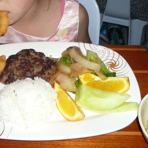 サンセット後は食事を頂きました。子供メニューもあり、ハンバーグをパクパク食べていました。大人はビーフとチキンをいただきましたが、可もなく不可もなくといった感じでした。ドリンクは飲み放題でした。