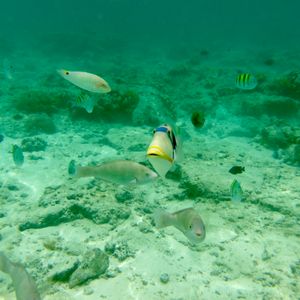 人がそこそこいるが海の透明度は高く、人慣れしてる魚を間近に見ることができる。