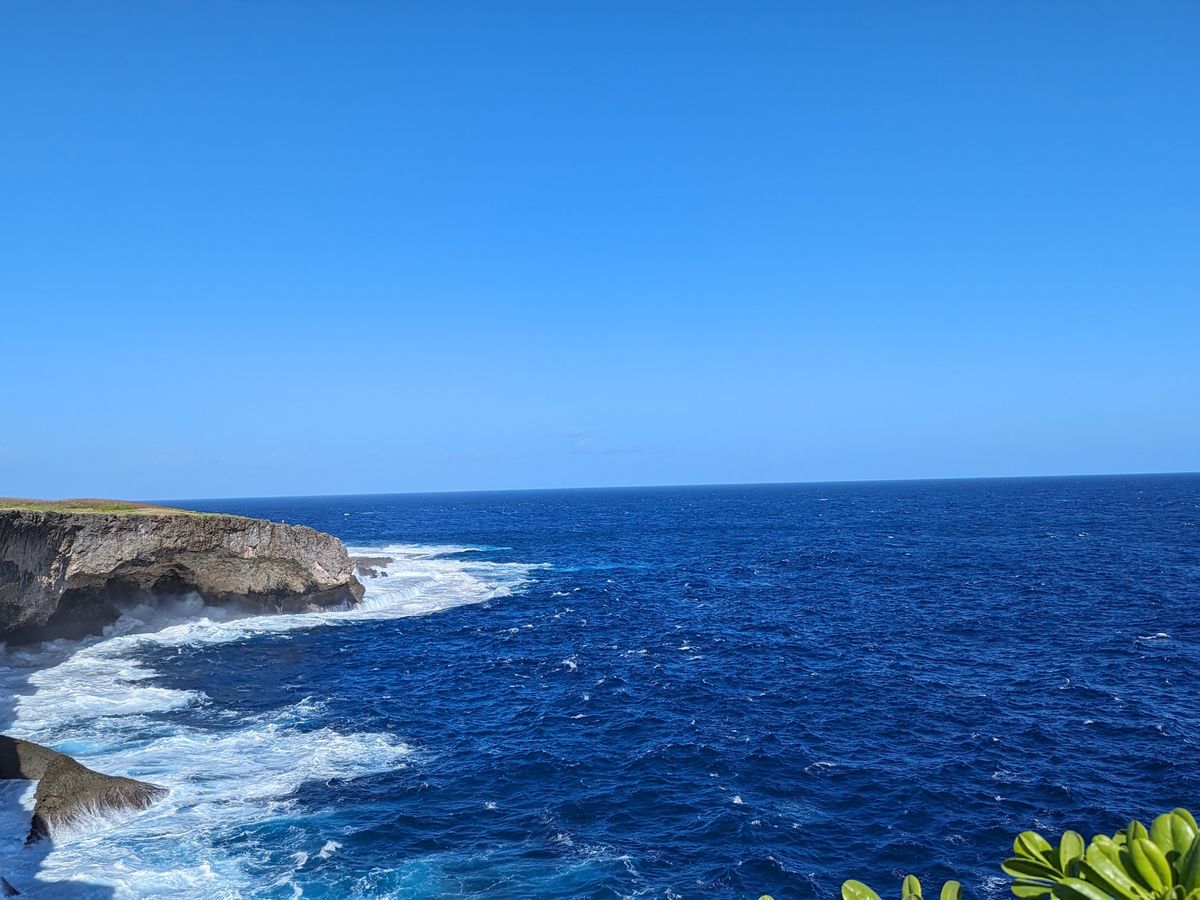 戦後80周年の節目として、1月の沖縄に続く、第二弾として今回サイパンを計画しました。ケイ子さんをガイドとする本ツアーでは、話には聞いていた玉砕突撃に伴い集団自決の地、バンザイクリフとスーサイドクリフ(自決の崖)=写真=の2カ所も訪れました。スーサイドクリフのがけっぷちに立つと足がすくむほど、崖は高くそびえ、米軍に追い込まれ、日本軍によって自決の道を選ばされた当時の住民のことを考えると、痛ましい思いでいっぱいになりました。「この場所から水平線を見ると、地球が丸い、ということがはっきり分かります」(ケイ子さん)。白い砂浜と、エメラルドグリーンと紺碧のコントラストが映える海は平和そのもの。当時の悲劇とを思い重ねると、改めて平和の大切さを痛感致しました。再びこの地を訪れることを誓い、サイパンを後にしました。