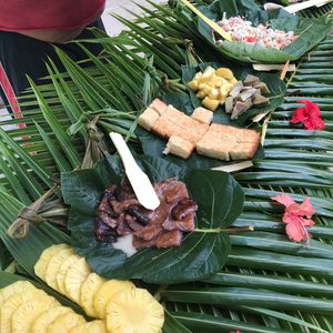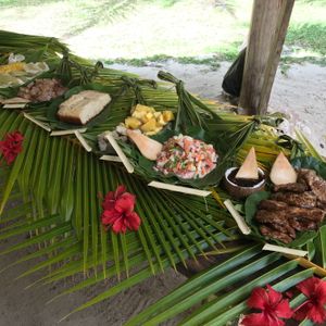 ガイドが用意したマグロのBBQにマグロのココナッツソースのサラダ、タロイモ、フルーツを葉で作られたお皿で手で頂きました!とても美味しくて、参加者はみんなお代わりしていました。その後、島でゆっくり休憩。