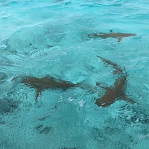 1.エイ、サメの集まるスポットでガイドが餌付けしている周りをシュノーケリング。エイやサメが自分達の周りを回遊している様は圧巻!他のツアー船も集まる場所でした。