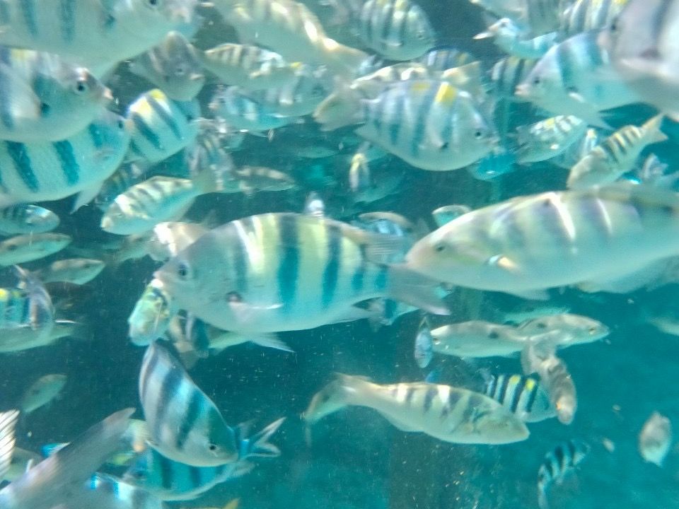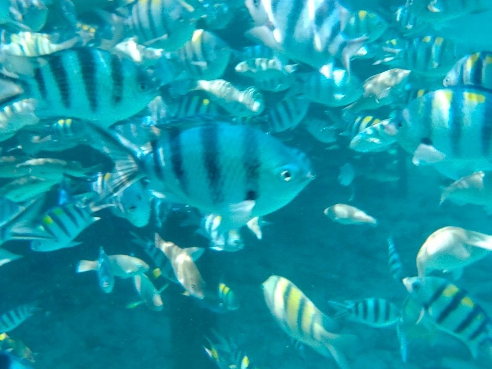ヒルトゥガン島、ナルスアン島でシュノーケリングを満喫しました。とくにナルスアン島では魚の数が非常に多く、桟橋の下には魚の大軍が整列していました。本当に驚きの光景でした。ヒルトゥガン島ではガイドさんからパンをもらって魚にあげました。たくさんの魚が寄ってきました。