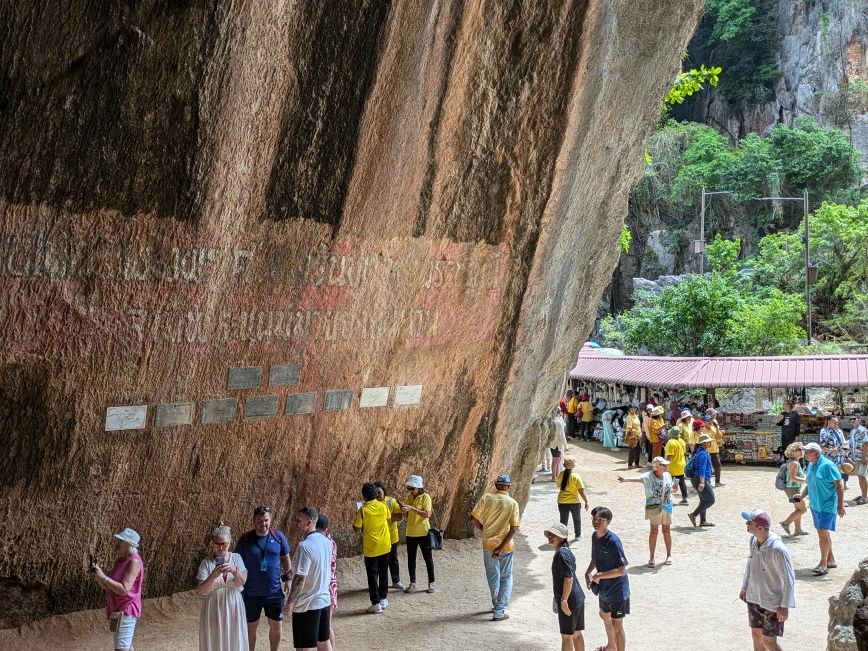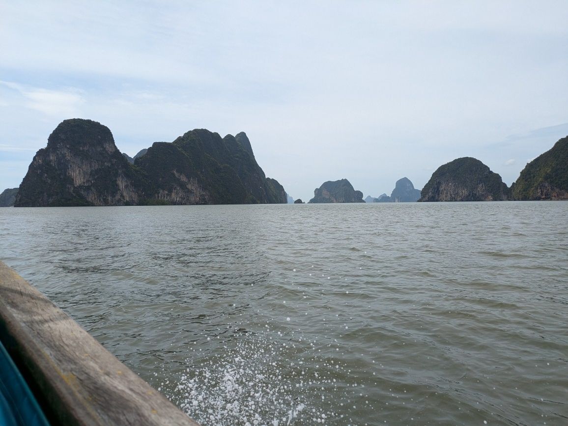 AM8:30分前に上陸桟橋前の待合わせホテルに着き、約1.45分のドライブでパンガー湾に着き、20人?乗りのテールボードに2人だけで、海の桂林を思わせる景色を50分程堪能し、通称007ジェームスボンド島へ、露店もあり人がいっぱい、湾で必ず寄る観光地で泳いている西洋?の方もいました。
