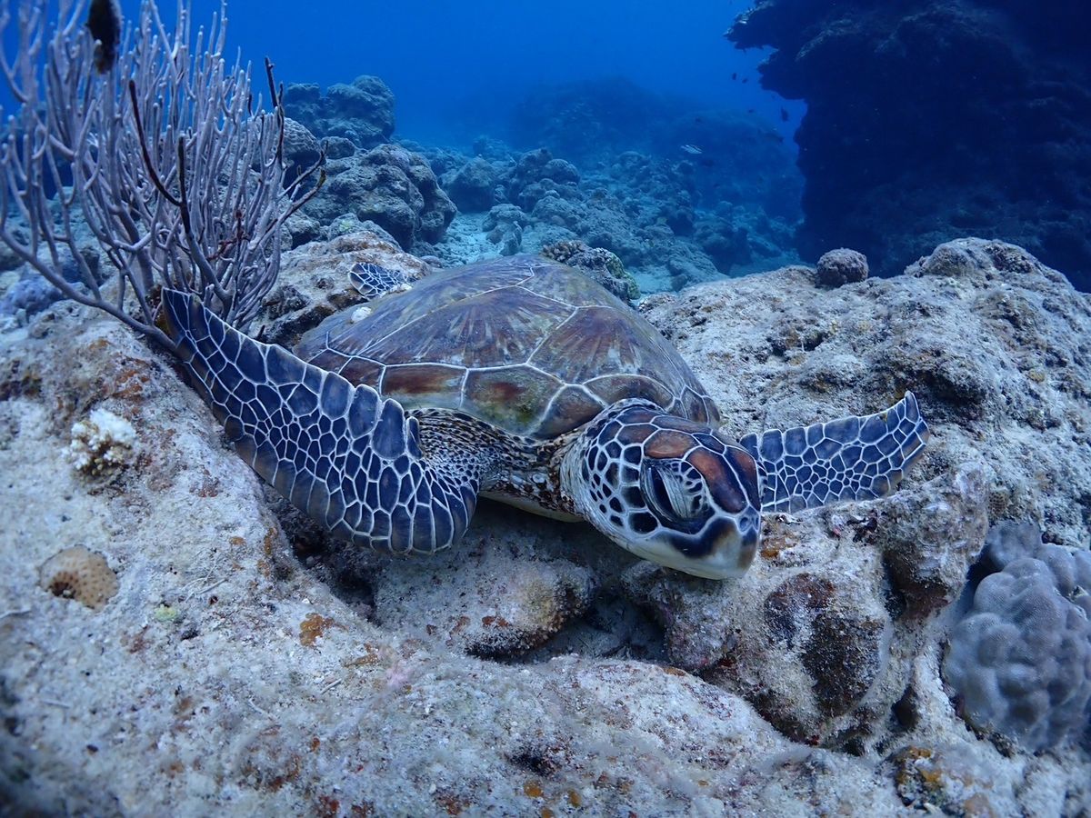 その後、もしできればとお願いしていた私のファンダイブまで敢行できました!前日の雨で濁りがあり、途中は味噌汁!?な海中の移動でしたが、サポートが万全で本当に安心してお任せすることができました。海亀も発見!一緒に泳ぐこともできました。写真も撮っていただき、最高でした!