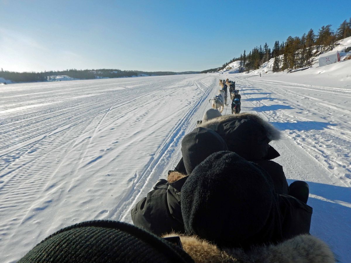 犬達は元気に(喜んで)走ってくれました。結氷した湖の上を爽快に激走した。晴れていたが冷たい風が顔に直撃。気持ちイ~