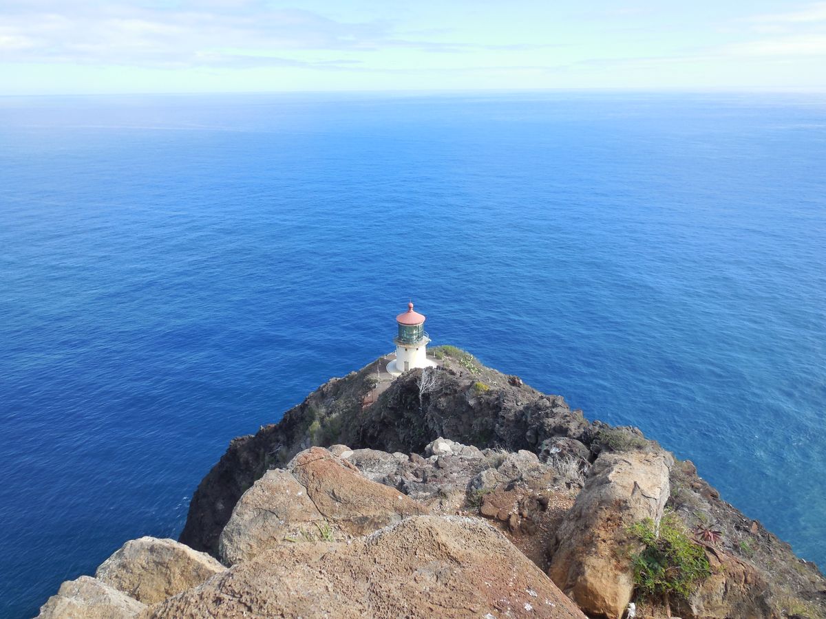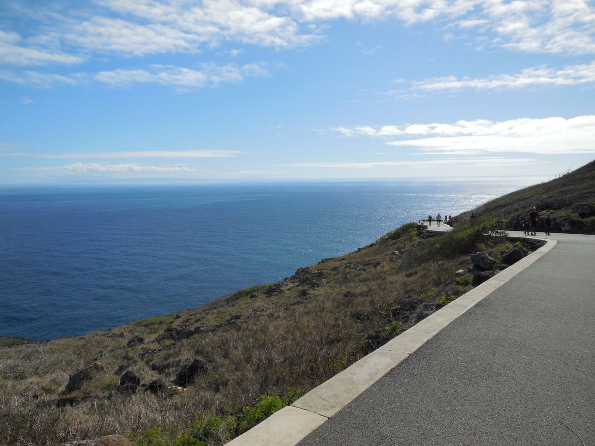 他のツアーにも含まれているマカプウルックアウトは、この岬の付け根にある展望スポットで、もちろんそこだけでも行く価値のある美景ですが、岬方向が小高い山になっているため、海原方向の眺望は臨めません。このツアーで行くトレイルはその小山を回り込んで、特に後半は大海原にそびえる絶壁の上を歩いて(歩道はよく整備されているので危なくはないです)、灯台を見下ろす最高地点まで上ります。その道中の景色の壮大さは、ルックアウトとは比較になりません。ぜひ体感してください。