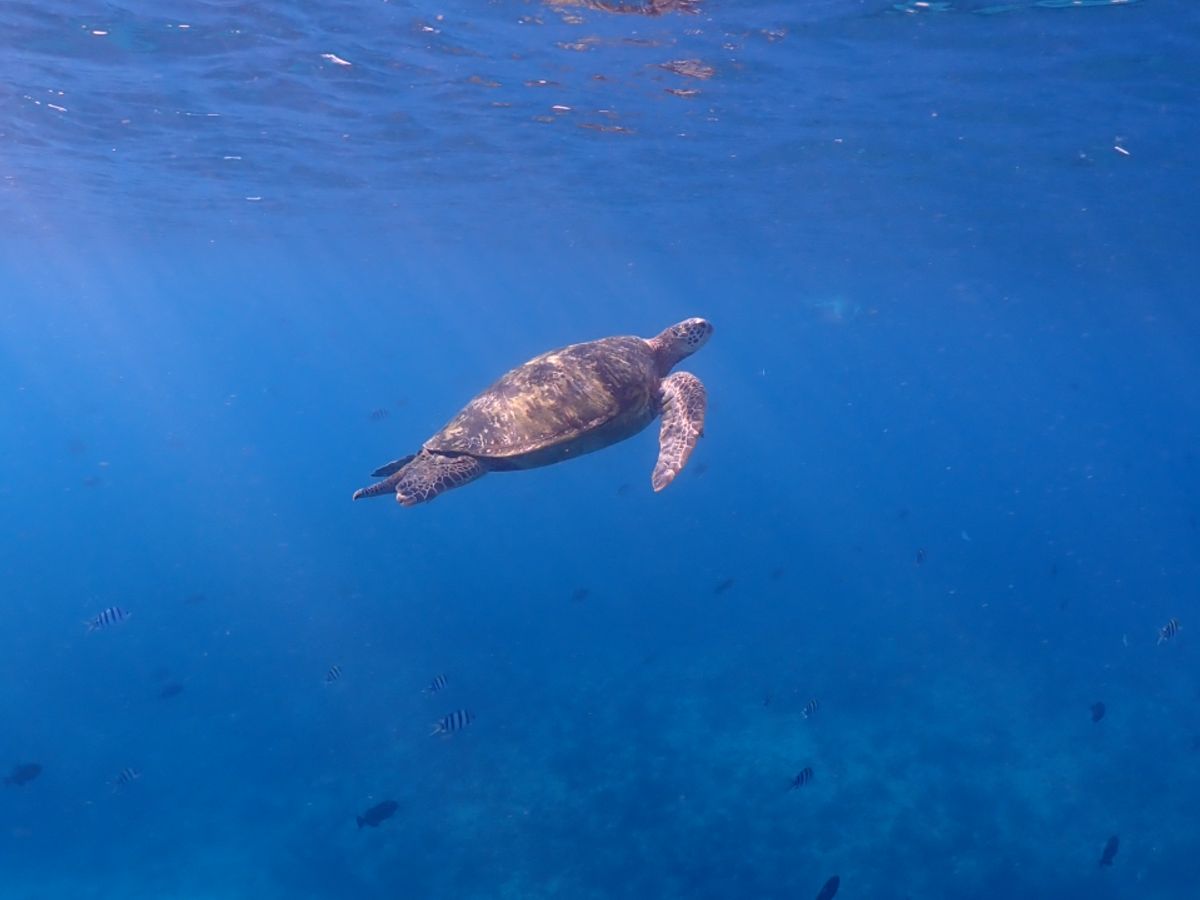 更に泳ぐと何と海底に海ガメが!そして何度もゆったりと近づいてきてくれました。