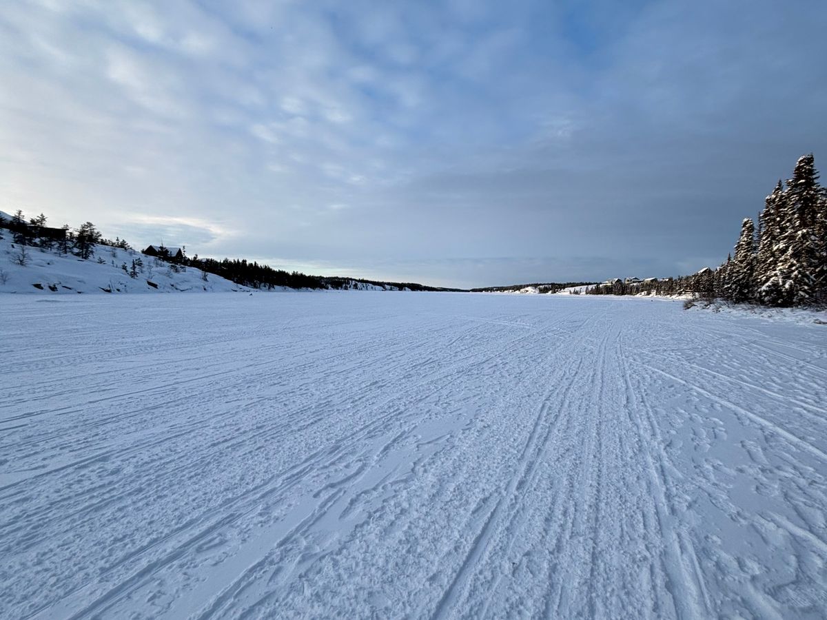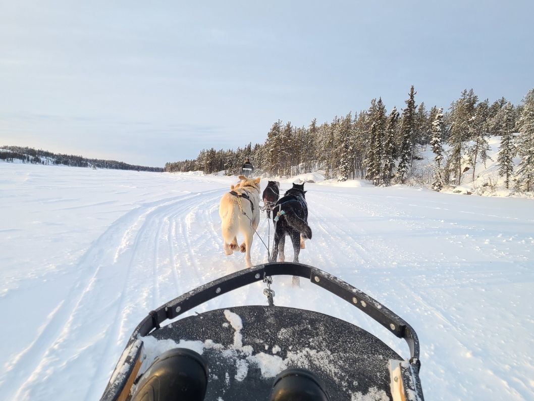 湖は本当にまっさらで美しかったです!犬ぞりという伝統的な移動手段を体験できたことは貴重な思い出となりましたが、観光のためにたくさんの犬が外のケージにいるのをみると、別の思いも感じました。