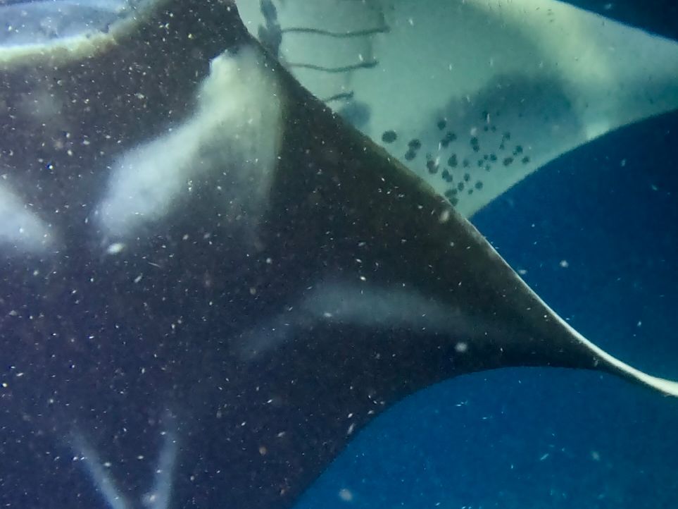 1枚だけでなく、左右から互いに近づいてくる2枚のマンタが、私の目の前でぶつかることなく、互いに体をそらして回転し、掴まっているボードにお腹スレスレで泳いで去っていく‼︎視線を下に向けると、3枚目、4枚目…見渡すと7枚は優雅に泳いでいました!!!そして順々に口を大きく開けてこちらに来るではないですか!