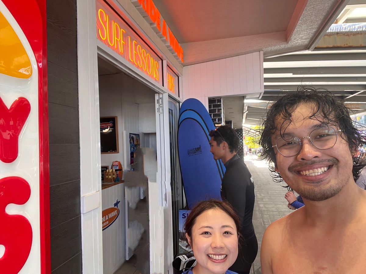 彼と2人で参加しました。2人とも初めてのサーフィン体験でしたが、15人程度の参加者に対して3人のインストラクターがついてくれたので安心して楽しめました。