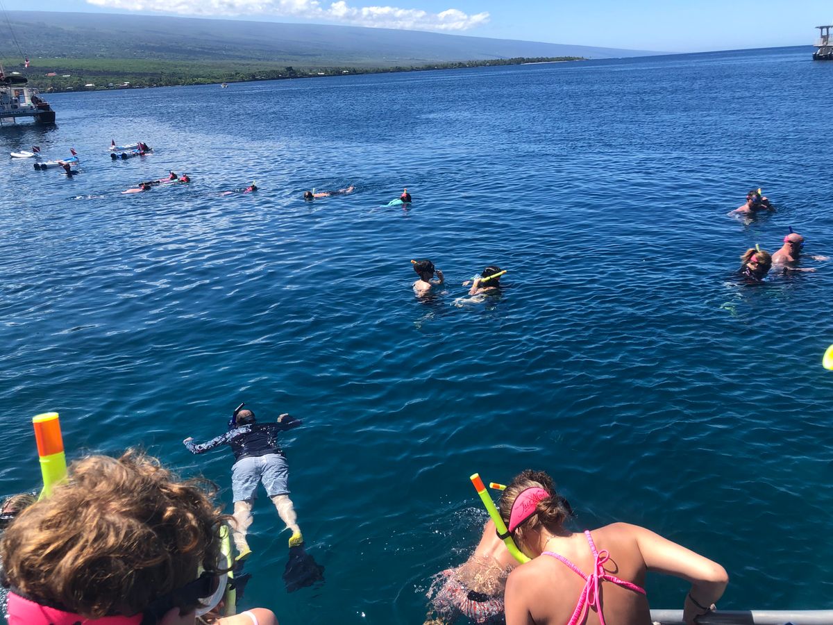 ケアラケクア湾でのアクティビティでは、美しい透き通った水の中、シュノーケルで多種多様なお魚に出会ったほか、10頭ほどのイルカの群が船のすぐ近くまで泳ぎに来たのに遭遇する事ができました。カタマランから水面へ飛び込む滑り台や、ジャンプ台など、子どもも大人も目一杯楽しむことができます。深い海に行く事を怖がっていた息子も、最後はジャンプに挑戦したくなったと、自然と美しい湾の魅力のもとで強くなった様でした。