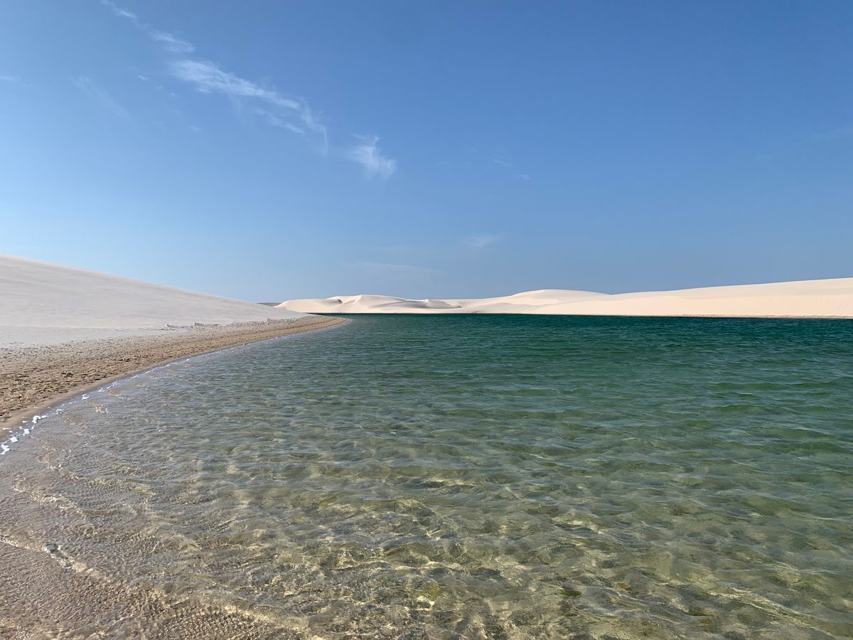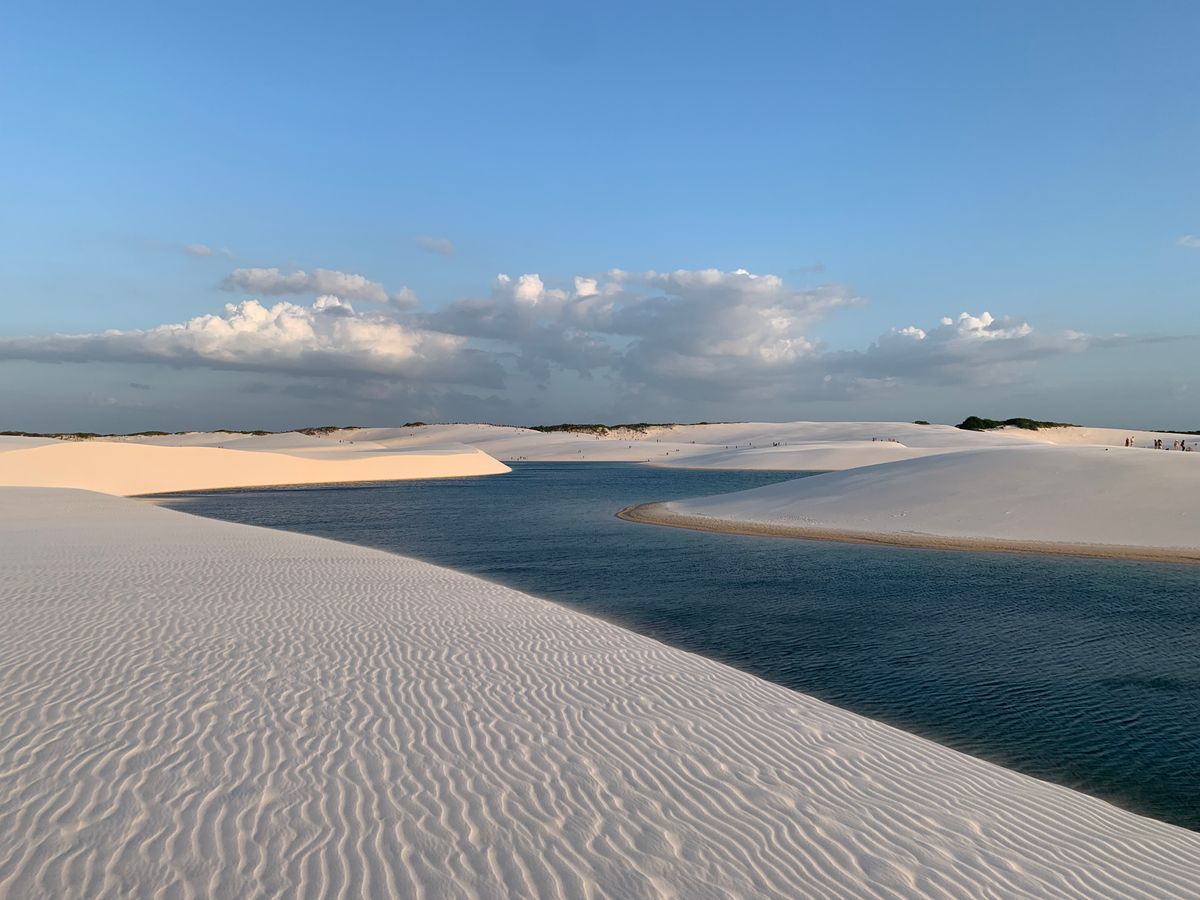 ハイライトとなる午後からの大レンソイスでは文字通り息をのむ絶景でした。序盤の日が高い時間帯は白砂と水の青さのコントラストが非常に美しく、その情景が彼方まで続く様は同じ地球とは思えないほどでした。リョーマさんが途中、我々家族の写真を撮ってくださり、後からデータを共有してくださります。もちろん砂丘にできる湖の中で泳ぐこともでき、水温も少し暖かいぐらいで泳ぐのにちょうどよかったです。入口に近い湖のラーゴボニータを中心に過ごしましたが、リョーマさんが人の少ない所に連れて行ってくださり、写真撮影などもしやすいです。最後に高台へ移動し、砂丘の向こうに沈む夕日を眺めてツアー終了となります。帰りは同じくジープでバヘイリーニャスに戻り、ホテルや指定のレストラン前などで解散となります。