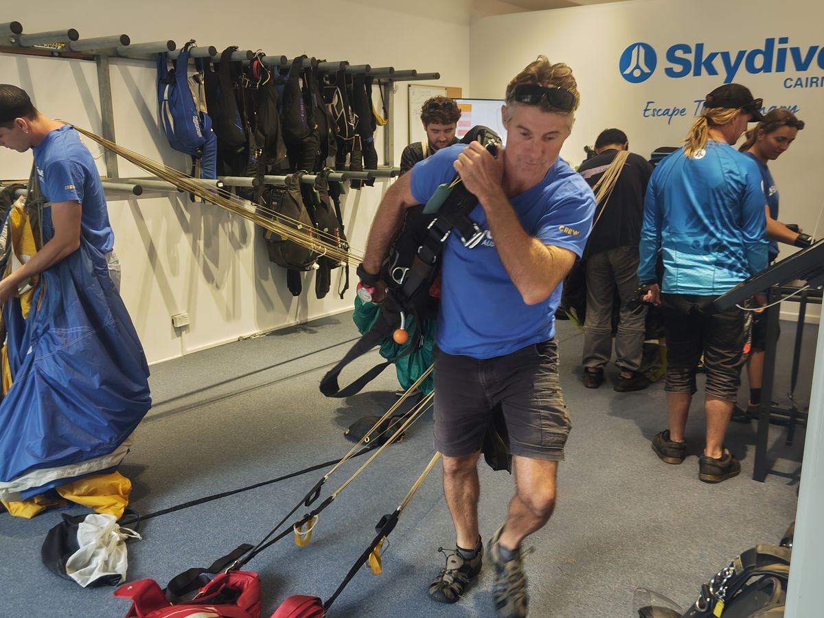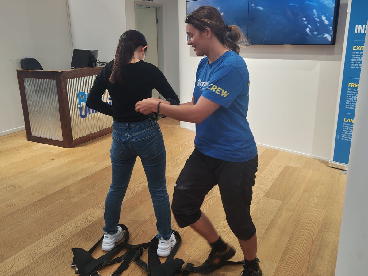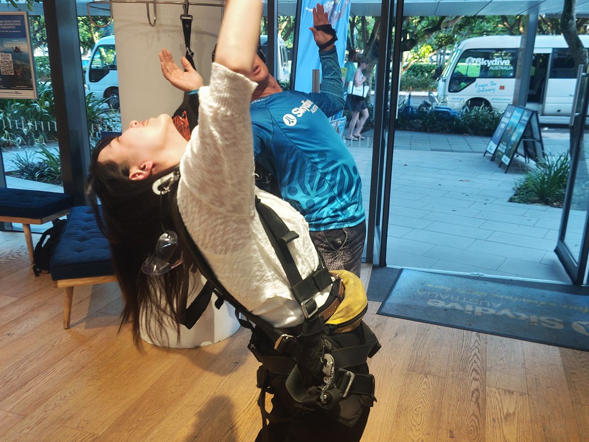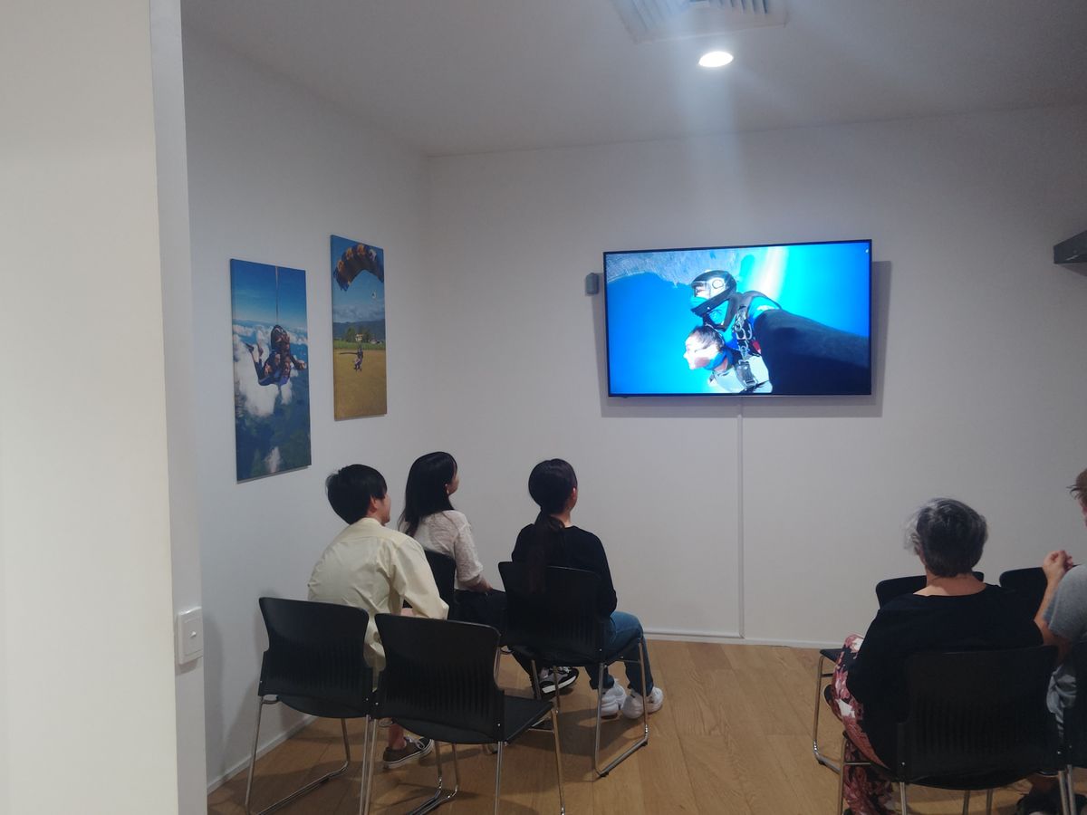 受付を済ませ、ビデオでの説明(日本語字幕)のあとインストラクターにハーネスを着けてもらい、飛び立つ時の姿勢等をレクチャーしてもらっていました。