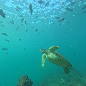 前夜豪雨、当日朝も曇り空で心配しましたが、予定通りに体験することができました。気さくな担当のお兄さんが丁寧に説明してくださりました。初めてのシュノーケリングと思ったよりしっかり泳いでいくことに少しドキドキしましたが、無事にウミガメさんと出会うことができ、2匹のウミガメが近くで泳いでいる姿や、また少し離れたところでも出会うことができ嬉しかったです!岸の近くはやや濁っていましたが、ウミガメのあたりの海は綺麗で珊瑚礁もよく見えました!