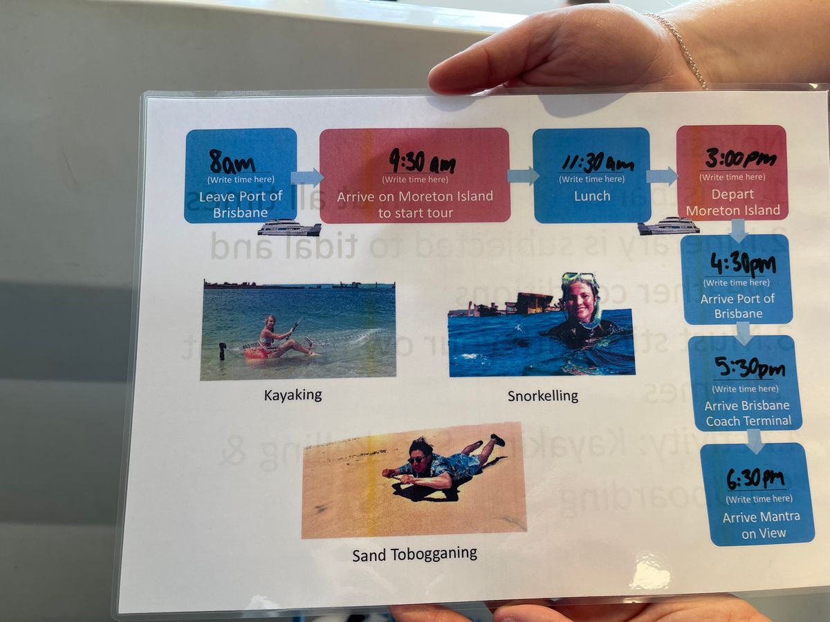 2023年8月にモートン島のツアーに行ってきました。朝早いのですがフェリーの中でミートパイやケーキ、コーヒー(何時以降など時間制限がありますがビールも)などが有料でいただけます。(帰りも。)オーストラリアは冬ですが天気が良ければ十分海に入れる温度でした。シュノーケリングは少し寒いかもしれません。着替えは基本屋外でタオルで隠して行います。ずっと水着でも大丈夫です。あらかじめ着替えていった方がいいです。