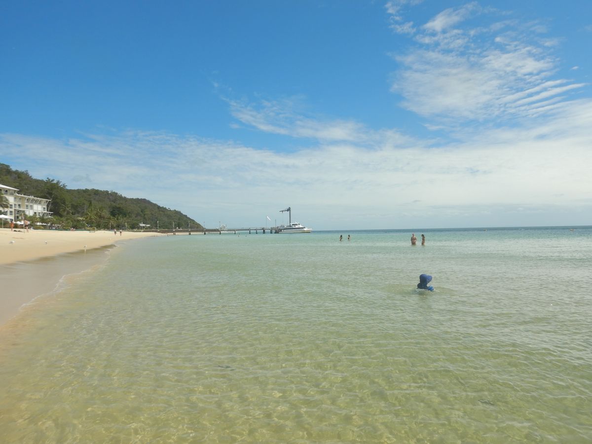 桟橋を進むと広くきれいなビーチに海鳥の群れが見えたり、沖の方でイルカらしき背びれが見えたりといきなりテンション上がります。まずはイルカの餌付け体験や砂滑りについての説明を聞きます。全て英語ですが、集合時間と場所は何度か繰り返し念押ししてくれます。この日はモートン島にも日本人スタッフが勤務されている日だったので内容を確認できました。毎日いるわけではないらしいのでラッキーでした。