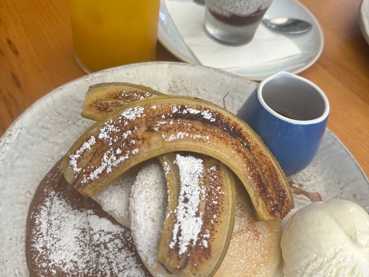 私の時は時期的なものなのか、チョコレートがたっぷりでチョコバナナパンケーキでした。チョコが好きなので嬉しかったです。12時に事前予約して伺ったのですが、私の時はちょうど空いていました。外のテラス席になるので、冷房の部屋を想像している方は注意してください。扇風機がかかっているので比較的涼めました。
