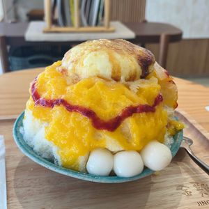 注文したのは「クレームブリュレマンゴー」。テーブルに運ばれてから、目の前でバーナーで丁寧に焦げ目をつけてくれる演出があり、期待が高まります!