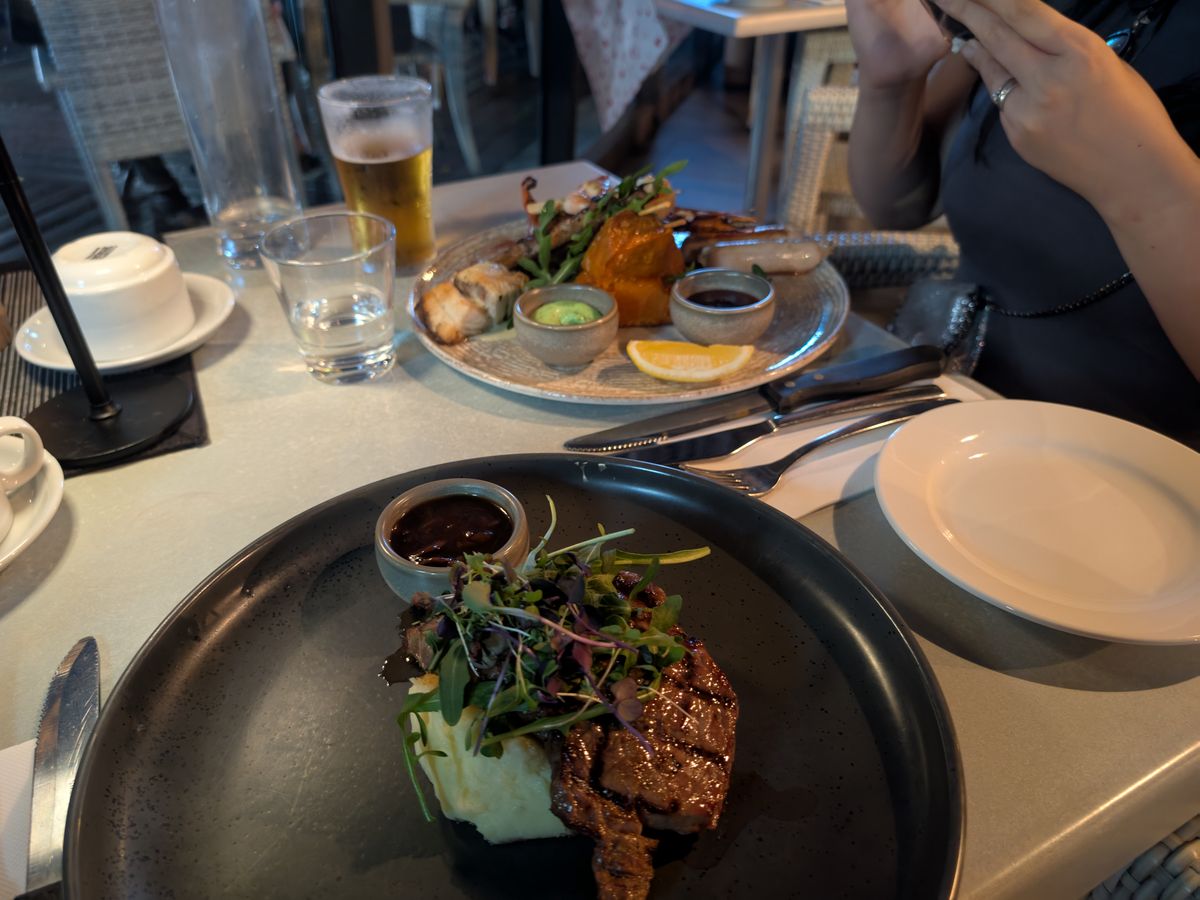 海側の素敵なお席。雰囲気は申し分無し。言わなくても日本語メニューを出してくださいました。テーブル担当はフランス人のとても可愛くてフレンドリーな女の子でした。シーフードタワー、ワニ,カンガルー,オージービーフが載ったプレート(名前忘れちゃいました)、クラムチャウダーをオーダー。他にも注文しようとしたら「食べれる?充分だよ。」とアドバイスしてくれて助かりました。実際にシーフードタワーは2人では食べきれず残念ながら残しました。色々な種類の海老があり美味しかったけどしばらくは海老食べなくてもイイかな〜。クラムチャウダーは絶品。お肉はシーフードでお腹いっぱいになってから出てきたので味わうよりも修行の様に食べました。でも何よりもこちらのプランはこの席を確保出来るなら本当にオススメです。コーヒーも付いてるので実質タダですね!