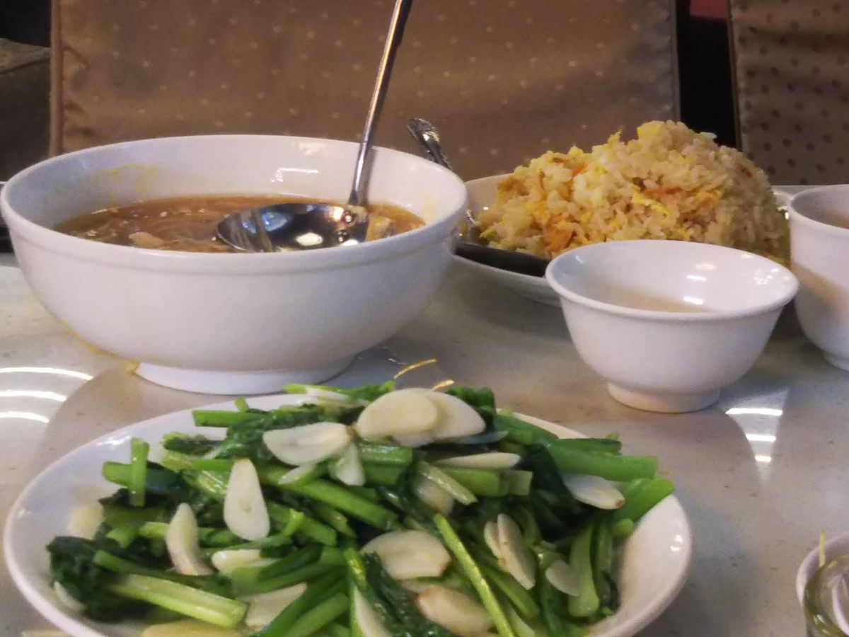エビシュウマイ、塩味がもう少し欲しかった青菜とニンニクの炒めもの、桜エビのチャーハンは香辛料が私には少しきつめ、酸辣湯と思われるスープは想像通り。デザートは蒸しパンのような可愛らしいもので、もちもちとした弾力でした。店内の客は地元の方より外国人が多いようでした。