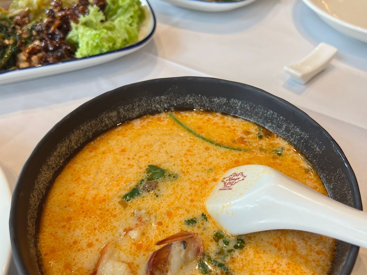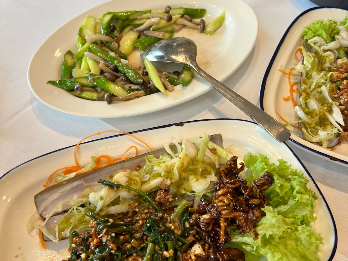 チリクラブは時価で間違えたら怖いのと中華料理屋さんなので大皿料理を少しづつ食べたかったのでこちらのセットにしましたが、前菜とスープは2人で分けてもいいいぐらいの量が1人一つづつ来ます。さらにアスパラときのこの炒め物、チリクラブのパンが8個、炒飯山盛りが来ます。