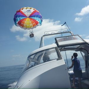 船やパラセーリング中はかなり風が強いため帽子など飛ばされないように注意!