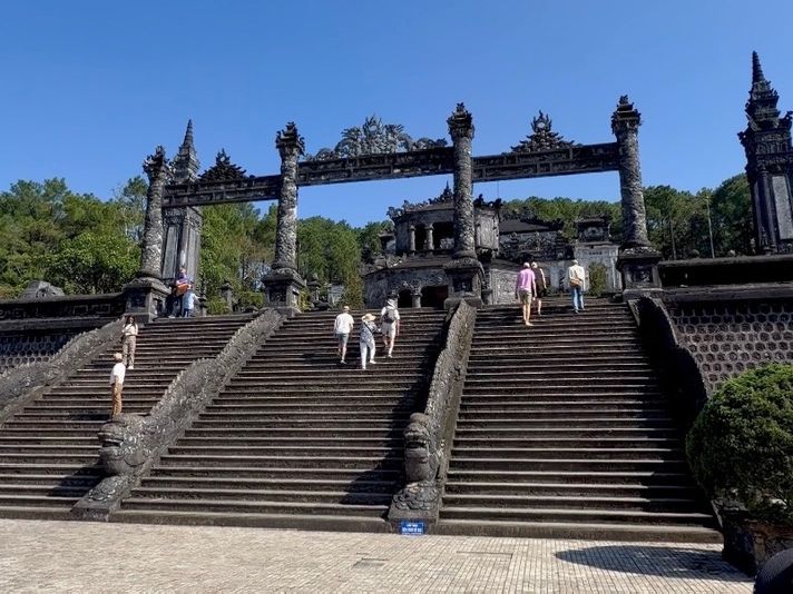 このツアーの始まりは、グエン王朝最後の帝廟のカイディン帝廟の見学でした。ガイドさんによれば、カイディン帝はフランスかぶれで浪費家だったため、多くの国民から受けましたとのこと。しかし、その陵墓は豪華絢爛で独特の外観で、皮肉にも、現在フエに残るいくつかの帝陵の中では、カイディン帝陵が一番人気だとのこと。その後、ティエンムー寺近くの岸辺までフエ名物のドラゴンボートに乗ってフォーン川を眺めながらのミニクル一ズはとても良かったです。ツアー説明文では、この後昼食とありましたが、ティエンムー寺からグエン朝王宮まで移動し、王宮を見学しました。ガイドさんの話ではベトナム最後の王朝が置かれたグエン朝王宮は、 ベトナム戦争でその大半が大破されたが、現在は修復が進んでいるとのことでした。破壊といえば、2025年の5月にベトナム人によって、国宝の王座が破壊されたために、その一角は立ち入り禁止になっていました。王宮の広大な敷地面積を歩いていると、歴史の重みを感じることができます。また、ガイドによれば、王族の姓である「グエン」が特別視され、多くの人がこの姓に改名したため、現在でもベトナムで最も多い姓とのことで、とても興味深い話が聞けました。遅めの昼食は、「イータオガーデン」でフエ王宮料理を食べました。この店の名物の「孔雀の形をした春巻き」はインパクト大でした。そして、私達は夜のフライトまで時間があったので、スパに案内してもらい、マッサージが終了したタイミングで、このツアーのドライバーさんに空港まで送ってもらいました。ありがとうございました。