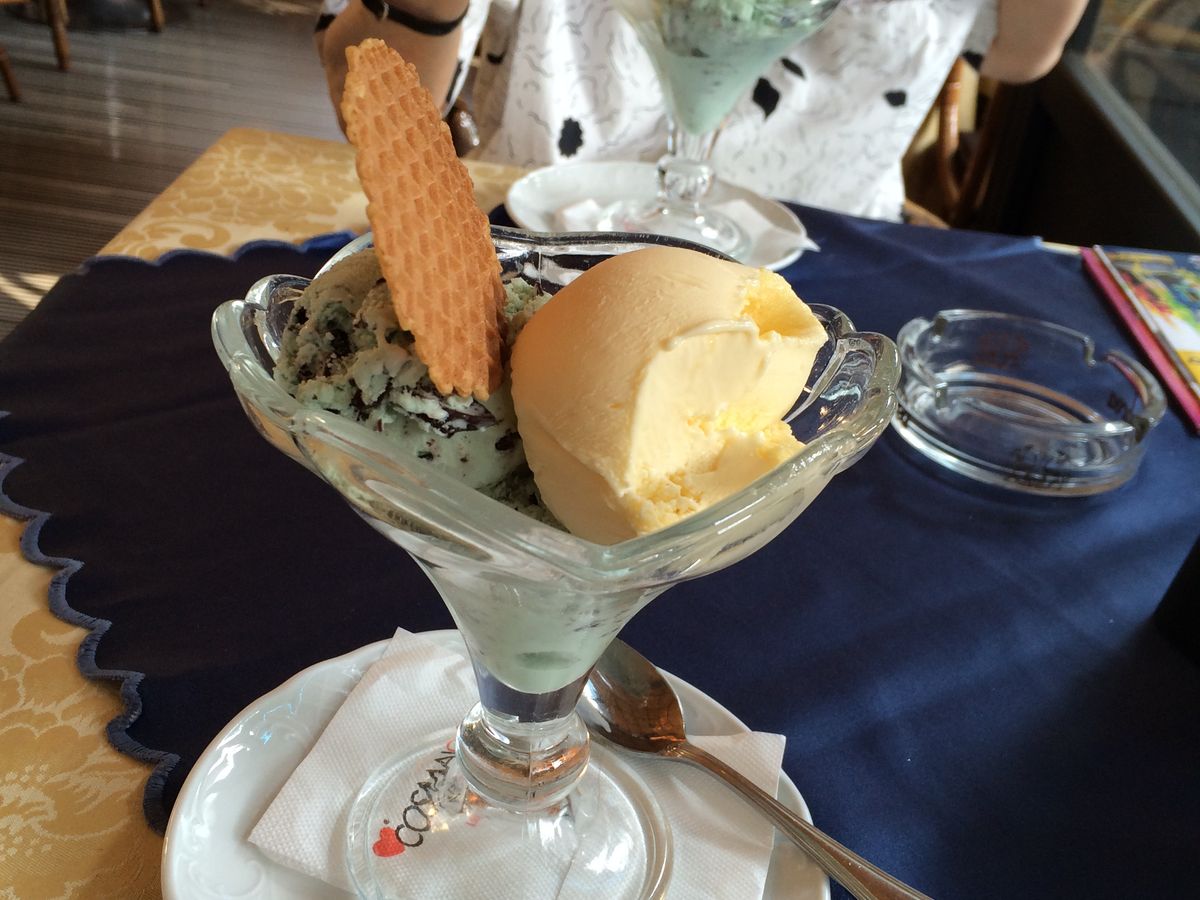 早く着いたので隣のカフェで。アイスクリームを一口食べたらあまりの美味しさにパチリ。集合場所も分かりやすくバスも大型で快適でした。言うことなしです。