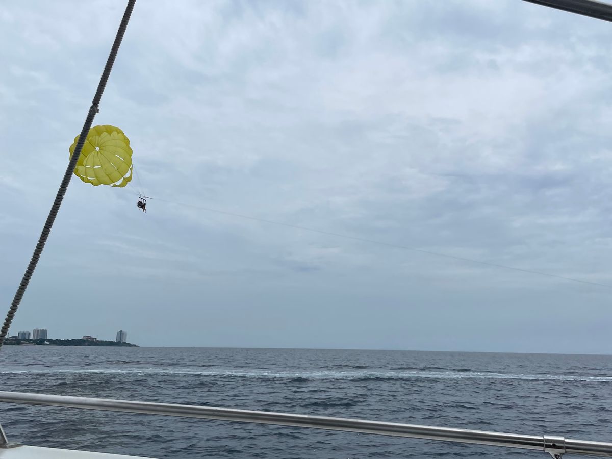 パラセーリングの受付では言葉が通じず、求められたIDというのが最後までなにかわからなかったですが、無事参加ができました。パラセーリング中は持ち込んだスマホで船から写真をたくさん撮っていただけましたし、最後には水中落下もあって楽しかったです!