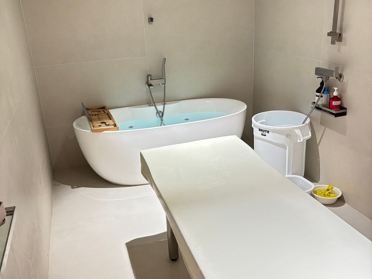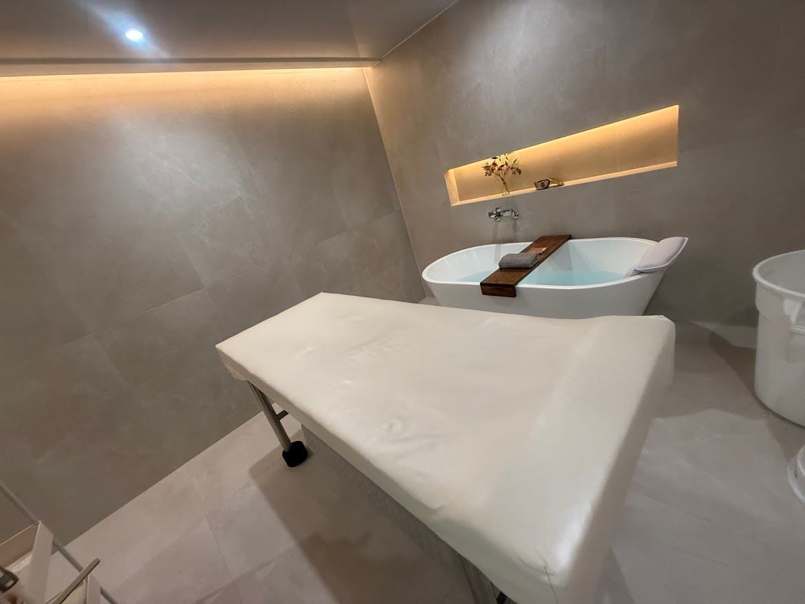 とても清潔でおしゃれな空間がドアを開けた瞬間に広がります。完全個室で、垢すり後はすべすべ、膝の黒ずみが気にならなくなりました。施術後は、ダイソンのドライヤーなど完備されたドレッサーでゆっくりと身支度できます。最後にバナナウユをいただきました。
