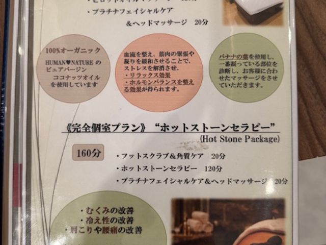 2時間30分のコースをやりました。フットが特に気持ちよかったです。また、シャワーも借りることができ、髪の毛も乾かしてもらえました。