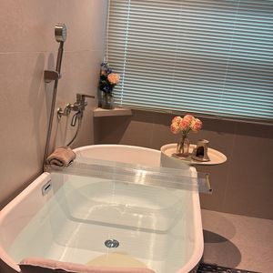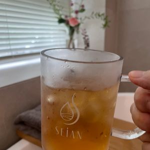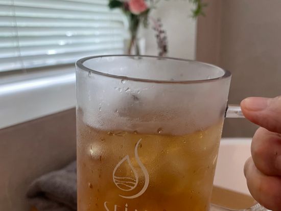 選んだ入浴剤を入れてくれて、レモンのコンブチャも持ってきてくれます。お湯は少し熱めだったので、氷の入ったコンブチャは、すぐに飲んでしまいました。意外と長い間入っていて体が熱くてのぼせそうだったので、最後の方は、湯船から出てしまいました。