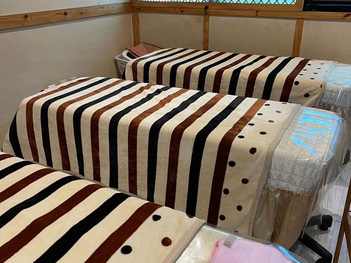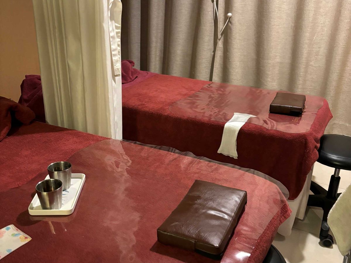 足を拭いてもらい、ベットに仰向けで寝かされます。ここで羽織は脱がされ、毛布をかけられます。部屋ですが、私たちの前に予約の方4名いて、並んで施術を受けているのをみれる状態です。(カーテンとかで見えなくしてくれてもよいのにと思いつつ)
