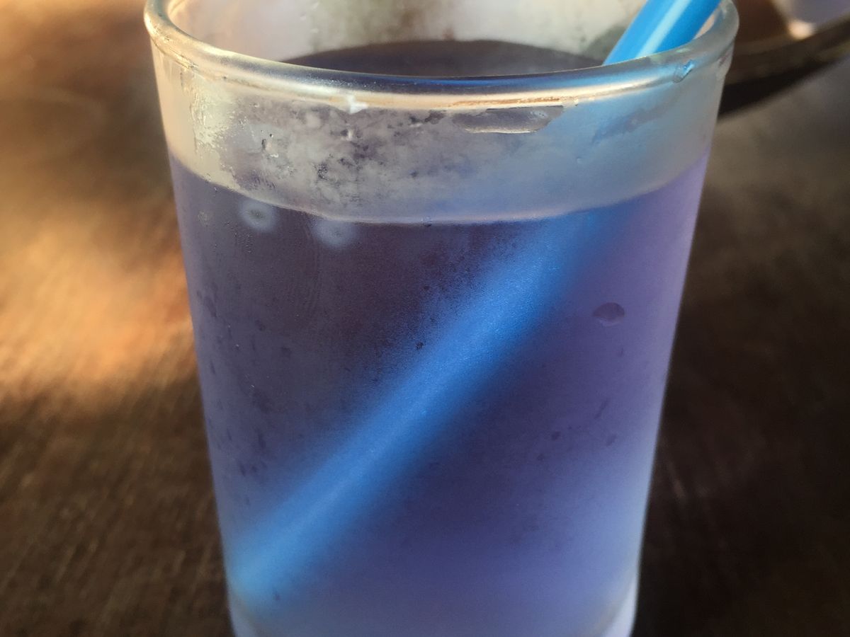 紫色のドリンクですが、タイではアンチャン(英名バタフライピー)と呼ばれるチョウマメと言うお花を使ったハーブティーなのです。