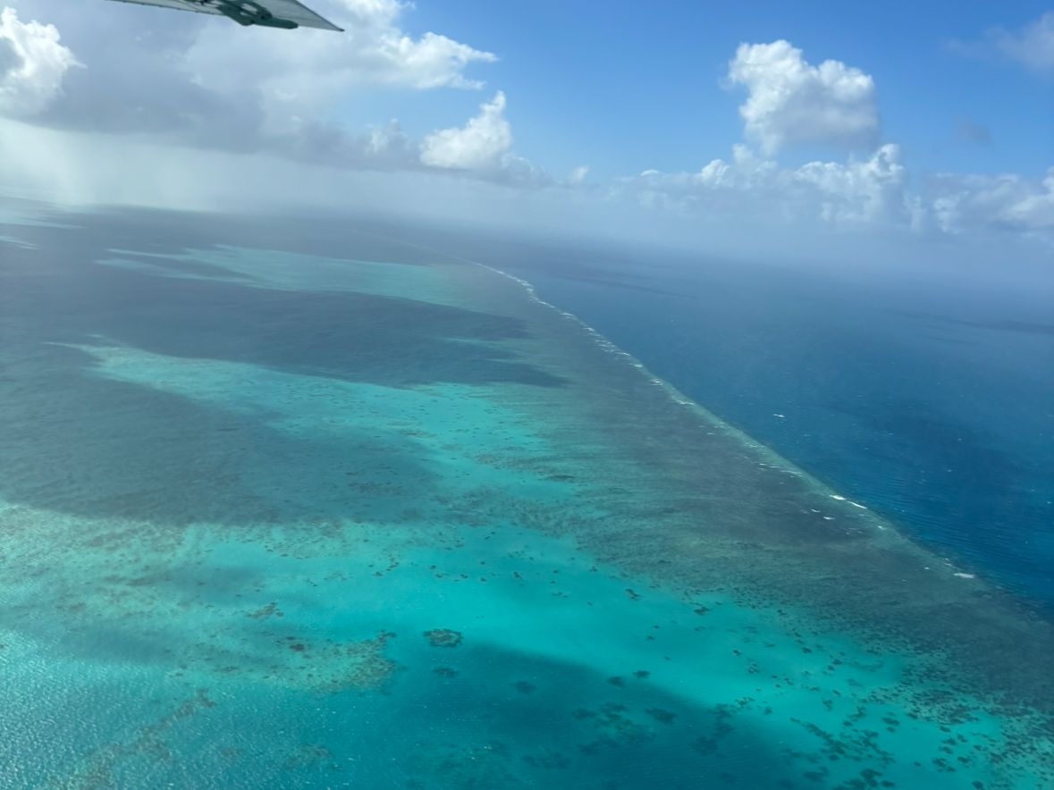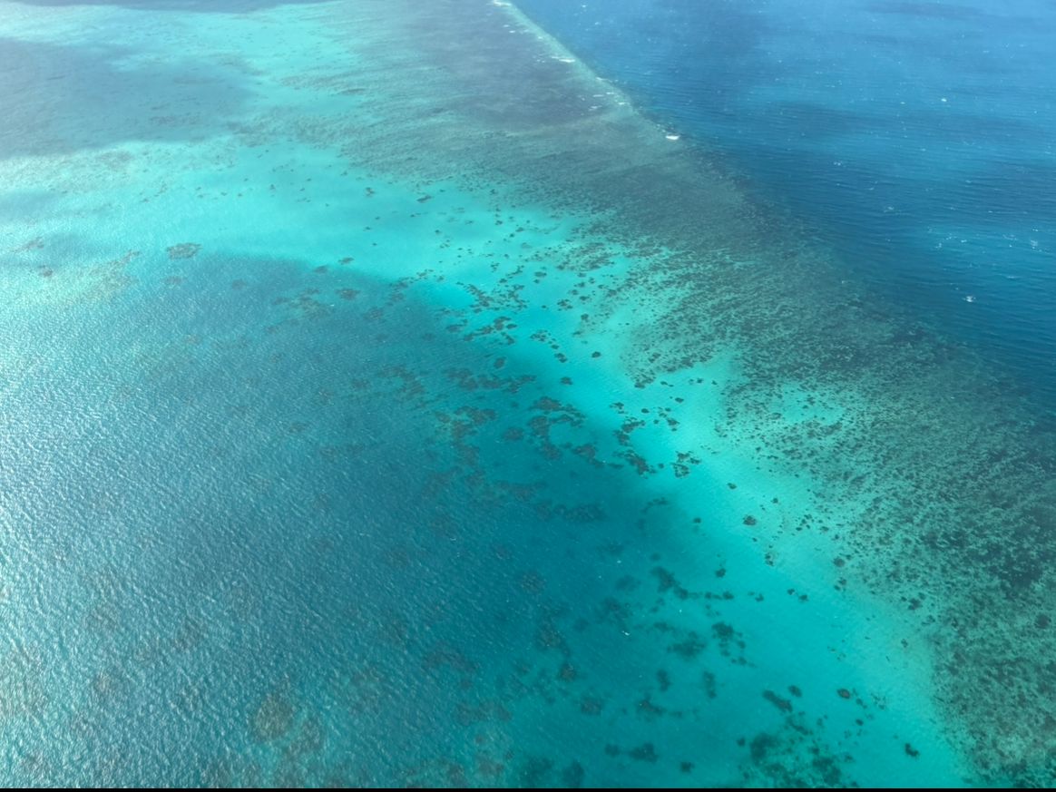 空から見るグレートバリアリーフの美しさは、生涯忘れられない光景となりました。天候に少々不安がありましたが、パイロットの方が雲のないエリアを選びながら飛んでくれます。