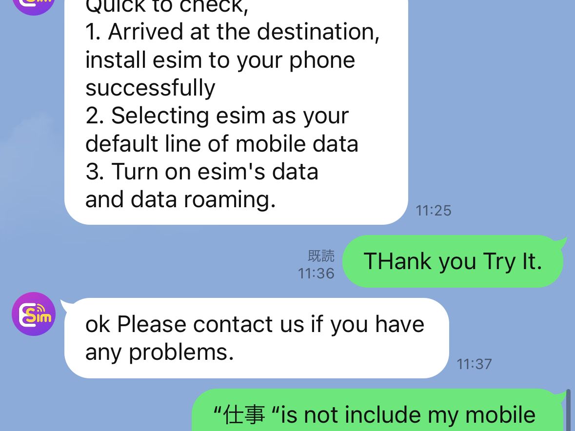 eSIMの利用が初めてでした。空港に着いてからインストールしたのですが、インストールに想像以上の時間を要し、うまくインストールできているのかとても心配になりました。それであらかじめお聞きしていたLINEのヘルプセンターに問い合わせたところすぐに応答くださり、英語でしたが状況を確認のうえ画面を共有しながらインストールに問題がないことを確認してくださいました。台北についてから、データローミングをオンすると、無事に繋がりました。