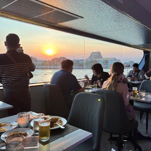 ビール飲み放題でしたがそちらは列も出来ず、バイキングの料理は凄い列でした。先に景色を楽しみながらビールを飲んで、それからゆっくり食事を楽しみました。乗船してしばらくして夕焼けが見れて綺麗でした。お腹がおちついてから階段で屋外に出て夜風に吹かれました。2回も上回も常にシンガーの方が歌ってました。