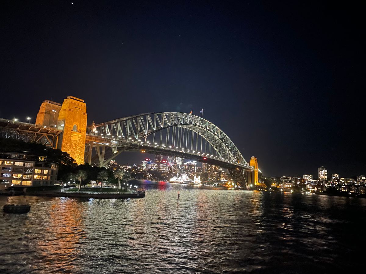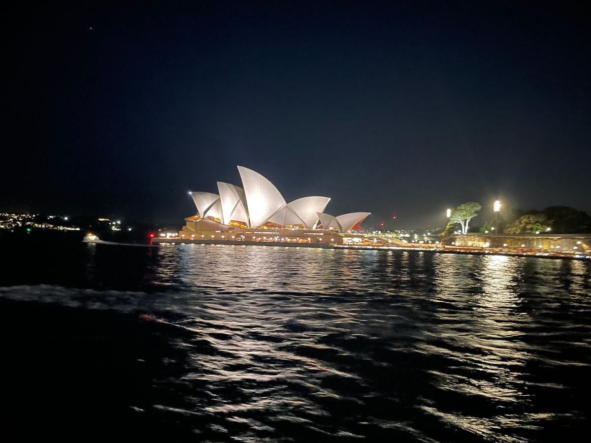昼のチケット交換時、5時20分に船が来るものだと思っていましたが、到着せず遅れて出航となり、ハーバーブリッジも後ろの空が暗くなりサンセットを過ぎてちょっと残念でした。食事は、お魚料理を選び堪能出来ました。戻りのハーバーブリッジとオペラハウス、また、港のビル群は、綺麗でした。船の揺れ具合も心地よいし、クルーズの雰囲気を楽しむことが出来ました。