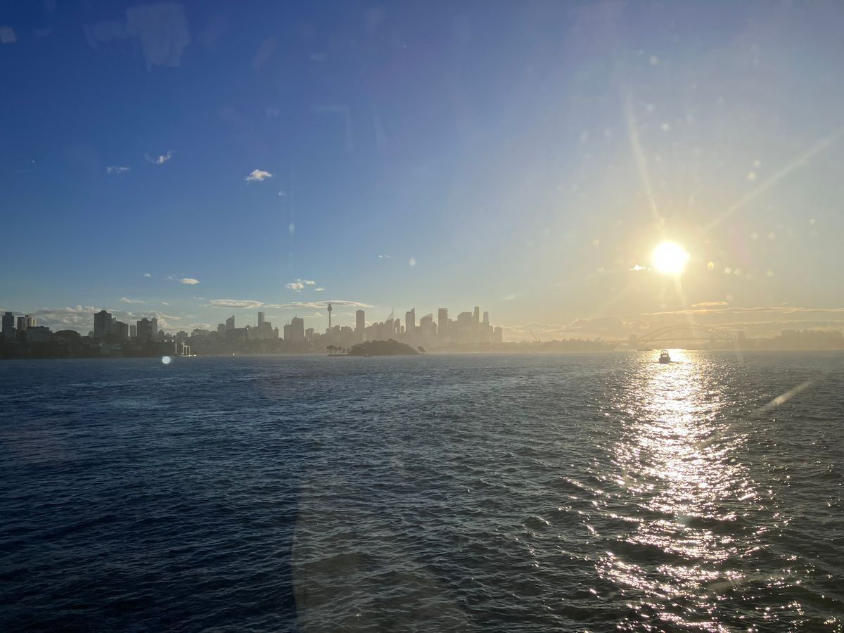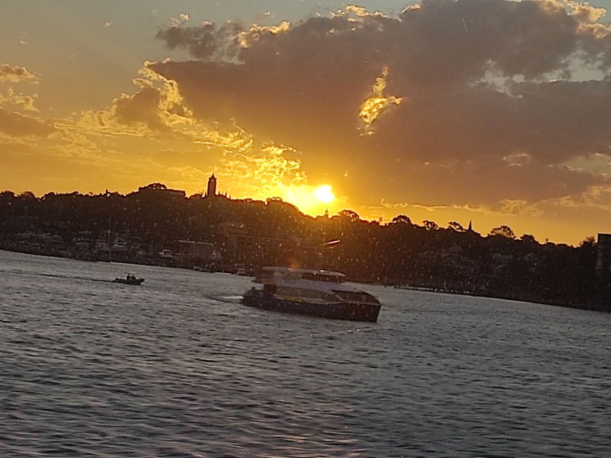 早めの出港、左側に夕陽が沈む絶好のロケーションで、3階は空いていて 先ずはビールで乾杯。ハーパーブリッジの下を潜り、前方にオペラハウスがくっきり、後から乗船者を乗せて食事に舌鼓、右側に満月と気分は良し。Uターンして帰り道。デザートが甘すぎ、仕方ないここはシドニーだよね。