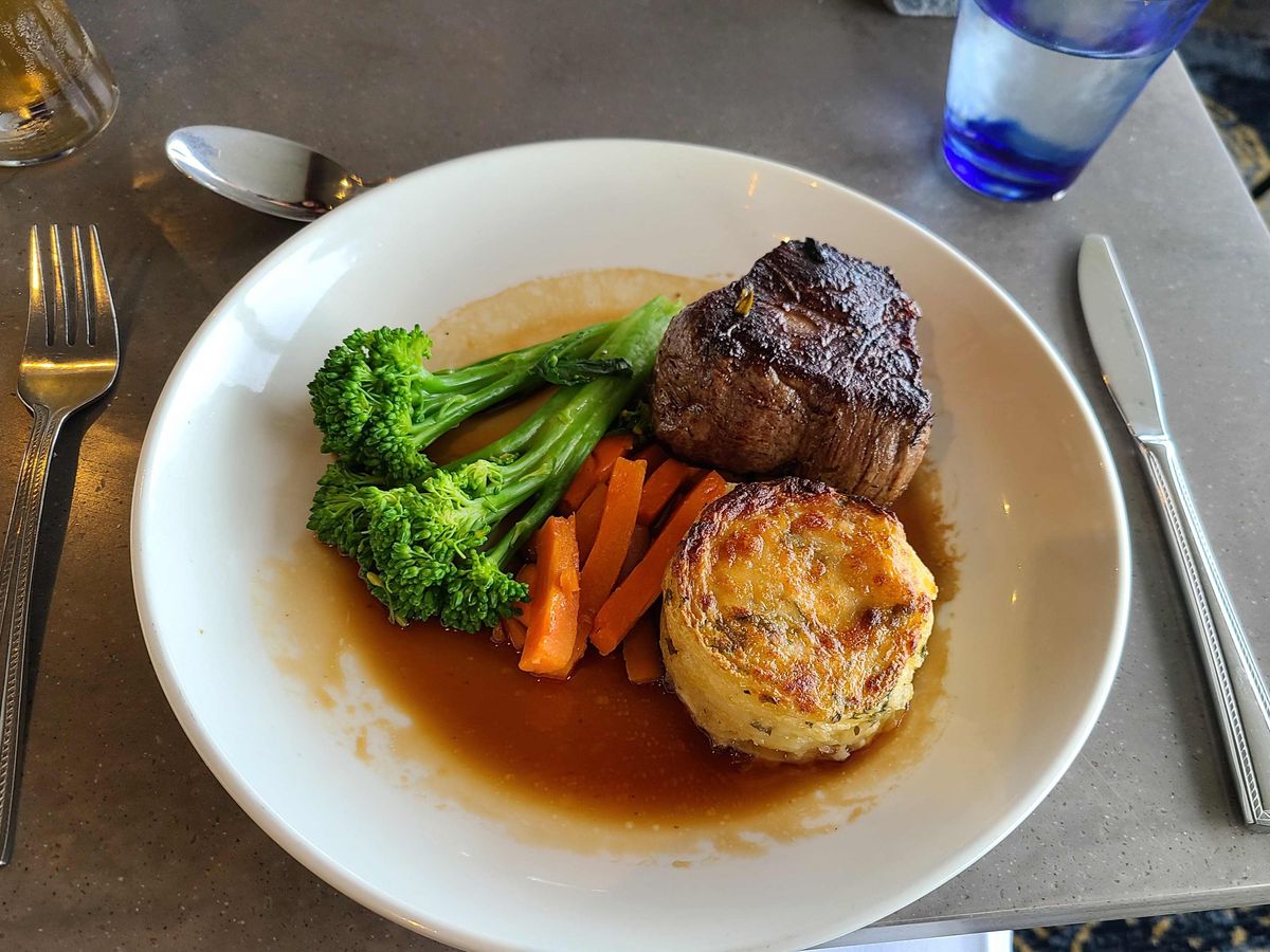 We thoroughly enjoyed the delicious dinner. The steak was exceptionally tender, and the fresh fruit sorbet was our favorite. The servers provided excellent service as well, and the entertainment complemented the rainy weather, creating a more relaxing atmosphere.