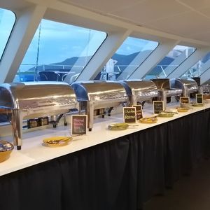 マリーナまではダウンタウンのホテルからタクシーで行きました。その際運転手の方にピアの場所がわかるか確認しました。ピアに一番近いところで降ろしていただきました。降りたところからすぐにクルーズ会社のブースがあり、2分くらい歩いたところに船があるとのことですぐにわかりました。バウチャーを見せて乗船。二階に案内されました。テーブルにはミネラルウオーターがありました。食事は魚やチキン、サラダやスープもあり美味しかったです。