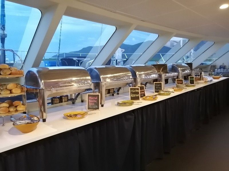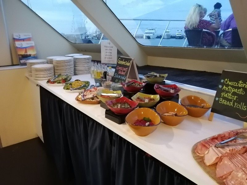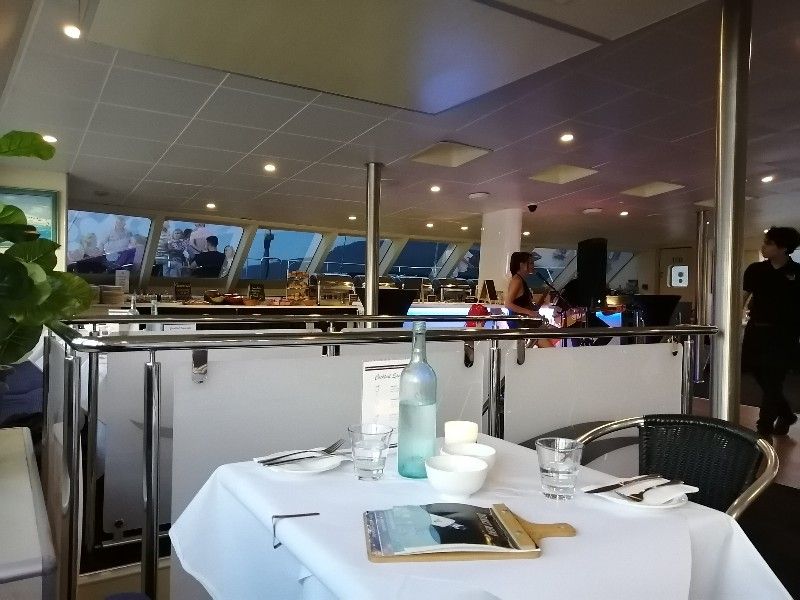 マリーナまではダウンタウンのホテルからタクシーで行きました。その際運転手の方にピアの場所がわかるか確認しました。ピアに一番近いところで降ろしていただきました。降りたところからすぐにクルーズ会社のブースがあり、2分くらい歩いたところに船があるとのことですぐにわかりました。バウチャーを見せて乗船。二階に案内されました。テーブルにはミネラルウオーターがありました。食事は魚やチキン、サラダやスープもあり美味しかったです。