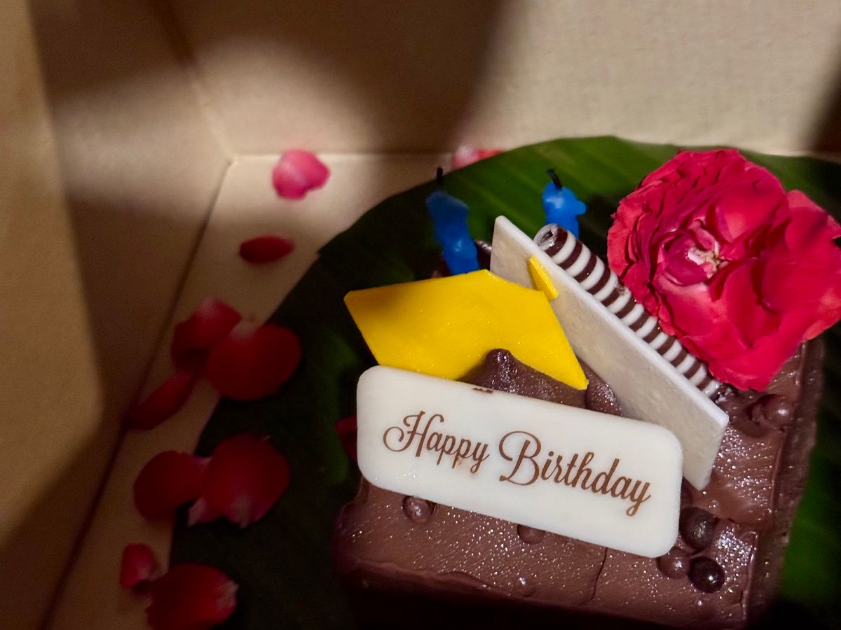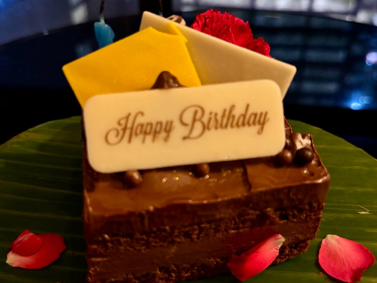 18:00出港、チェックインはアナンタラホテルの桟橋で、カナッペとタイティーのおもてなし。クルーズは8組18名で、全席窓側で、席は程よく離れていてプライベートが保たれています。ディナーは前菜、スープ、魚料理、肉料理、デザートで量も十分でお腹いっぱいに。クルーズ終盤にサプライズのバースデーソングとバースデー・チョコレートケーキのプレゼント。誕生日をクルーの方々にお祝いしてもらいました。