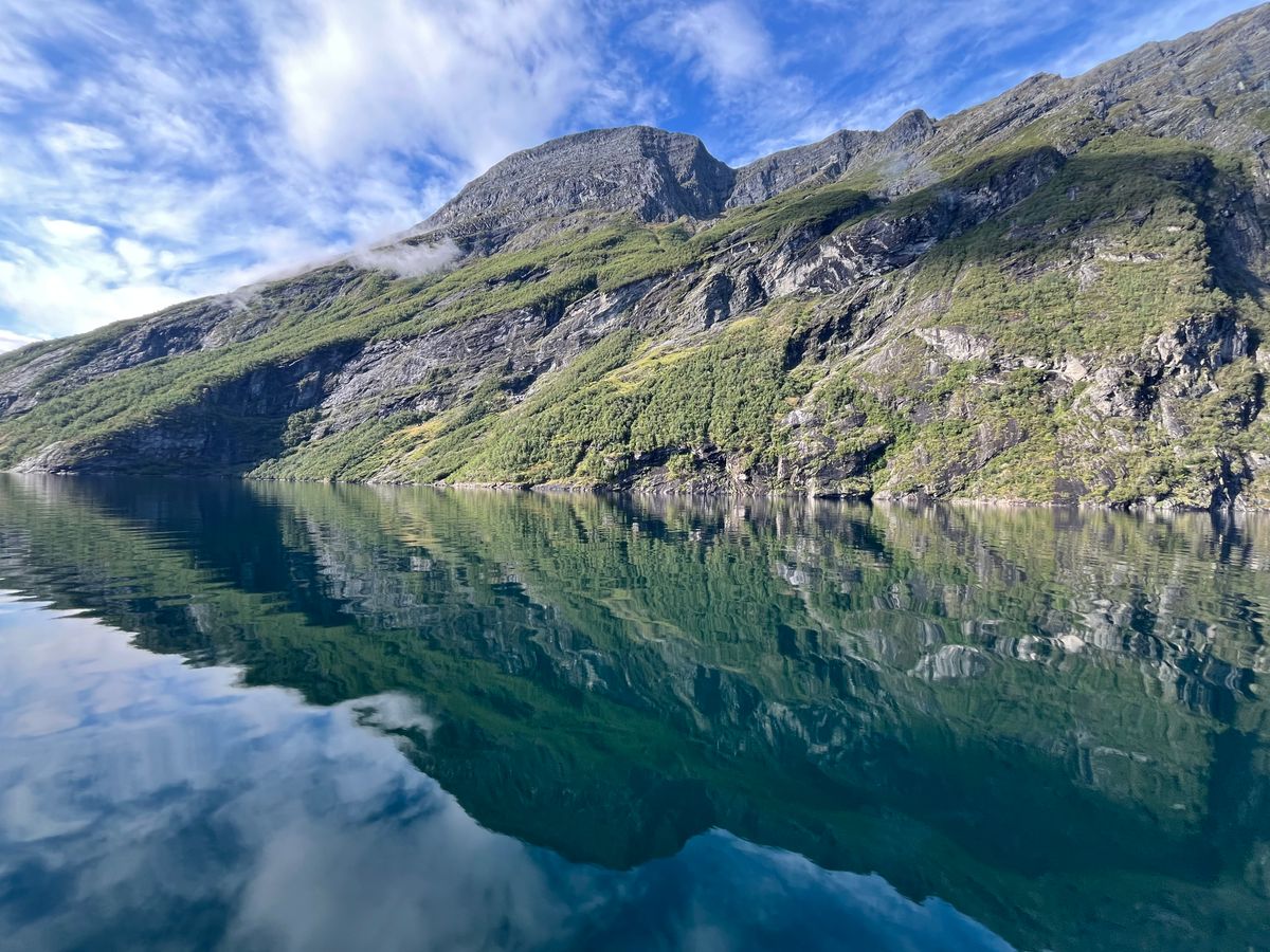 翌朝は雨。ただ、朝食後の出発時には止んで、クルーズ出航時には晴れになり、素晴らしい眺望をずっとデッキ上で楽しみました。寒かったですが手袋持参で良かった。フィヨルドの険しい山の景観、その連続はソグネフィヨルドを凌ぐスケールで、登山趣味の自分も船上からの景色に呆気に取られる凄さでした。