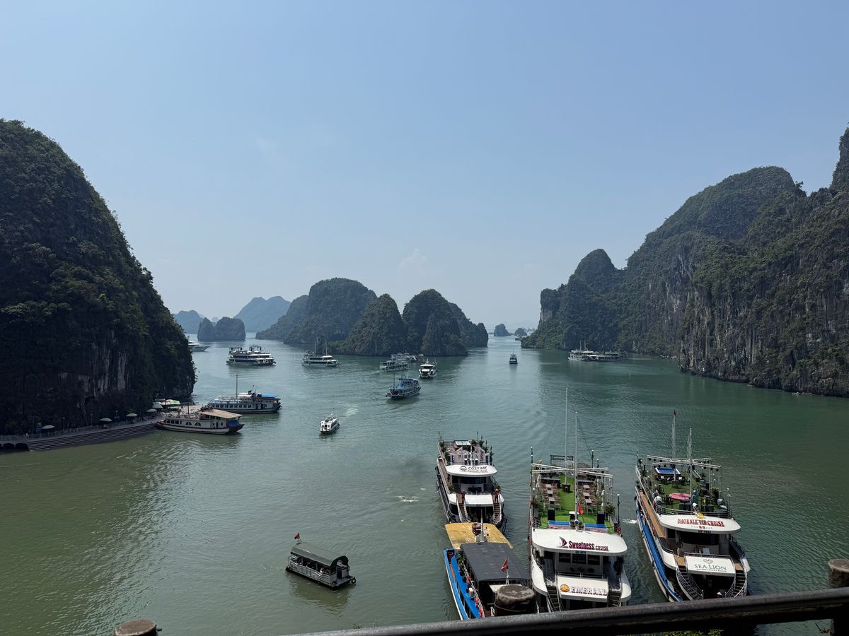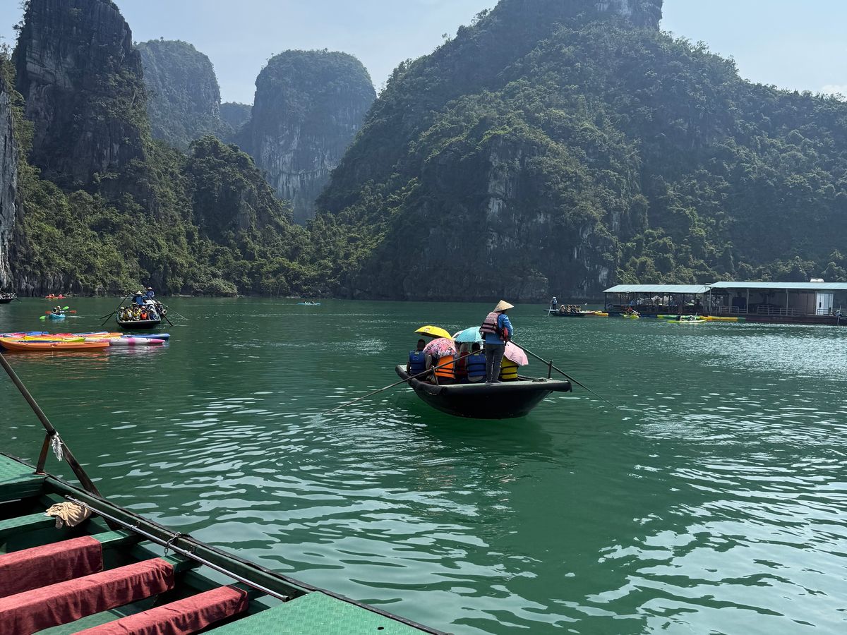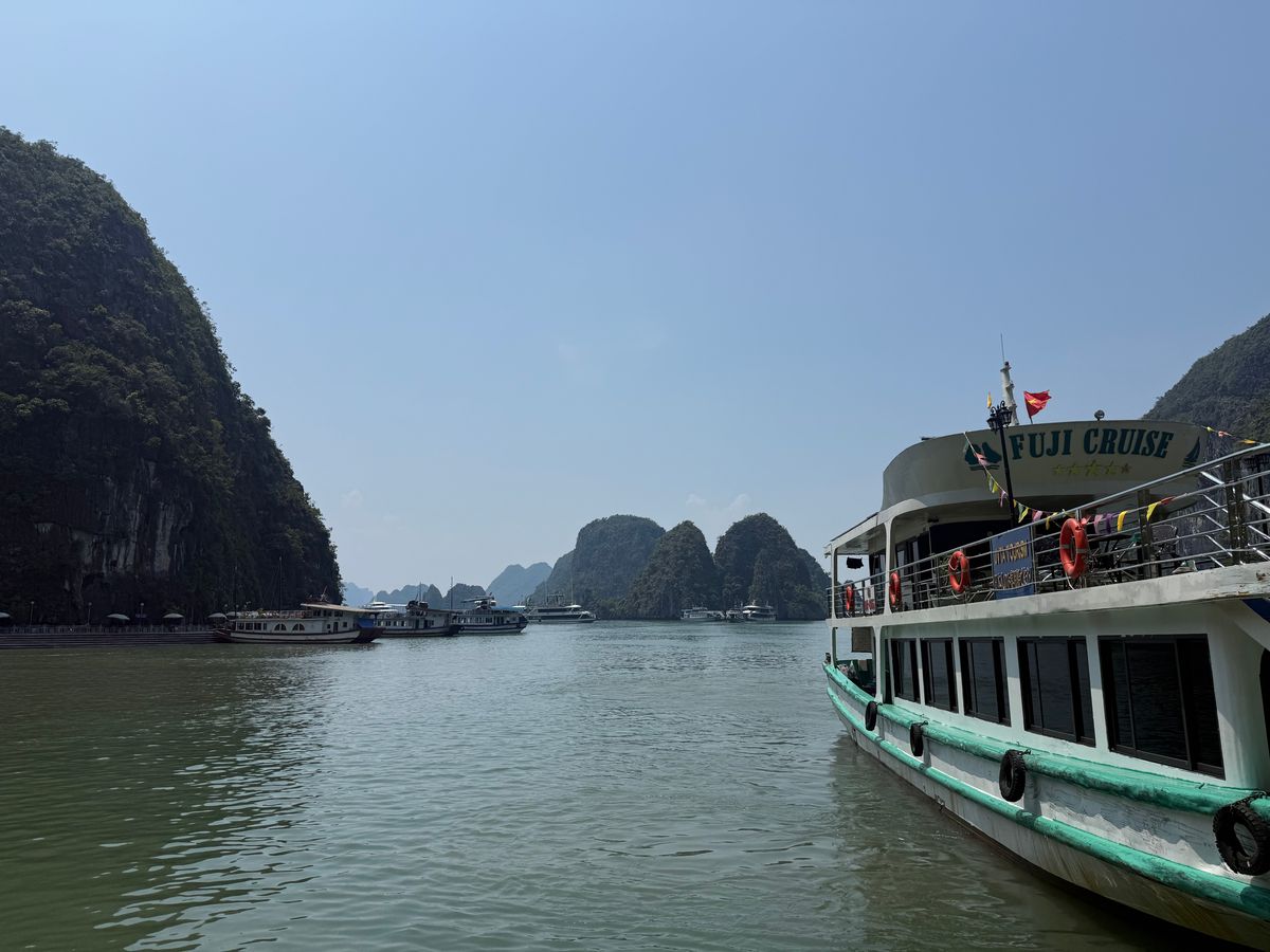 ハロン湾について日本人専用観光船 Fuji に乗りまずはランチ。相席ですがもう1組もお父さんと娘さんのコンビで居心地は良かったです。ランチの味もボリュームも満足。食後は元水上生活をしていたエリアでバンブーボート体験。Fujiに乗ってスンソット洞窟に移動して内部を探検。最後にティートップ島に行って山登り。気温がとても高い日だったので、特にティートップ島の900段の階段では全身から汗が吹き出すほどでしたが、船に戻ると冷たいタオルを用意してくださっていたので助かりました。また、とても手頃なお値段で水やビールを購入することができるので、こちらも助かりました。