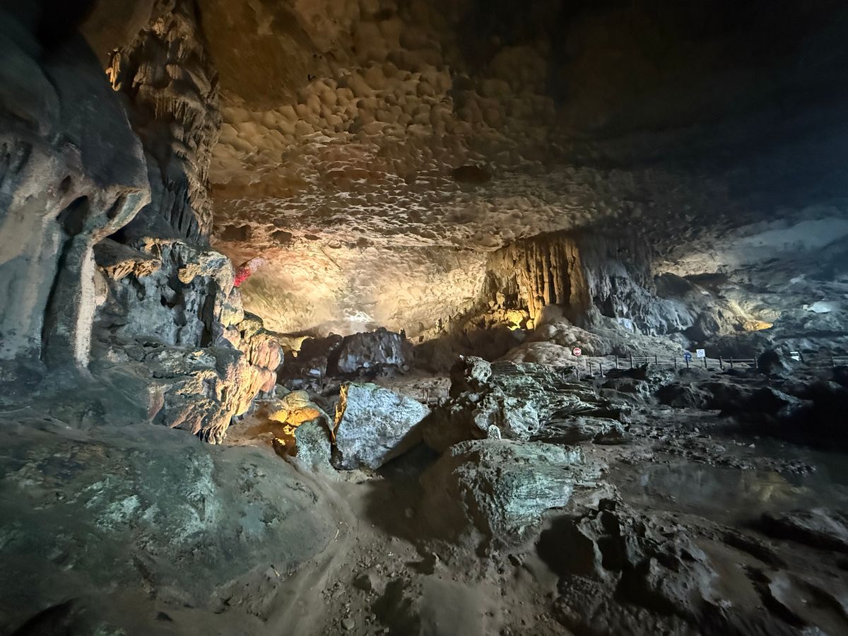 ハロン湾について日本人専用観光船 Fuji に乗りまずはランチ。相席ですがもう1組もお父さんと娘さんのコンビで居心地は良かったです。ランチの味もボリュームも満足。食後は元水上生活をしていたエリアでバンブーボート体験。Fujiに乗ってスンソット洞窟に移動して内部を探検。最後にティートップ島に行って山登り。気温がとても高い日だったので、特にティートップ島の900段の階段では全身から汗が吹き出すほどでしたが、船に戻ると冷たいタオルを用意してくださっていたので助かりました。また、とても手頃なお値段で水やビールを購入することができるので、こちらも助かりました。