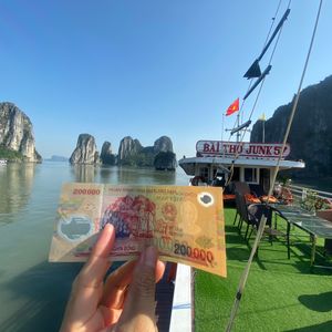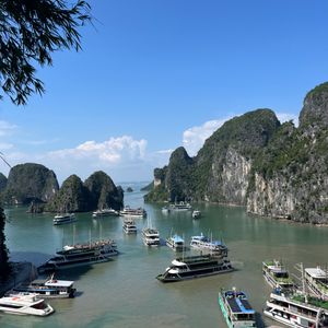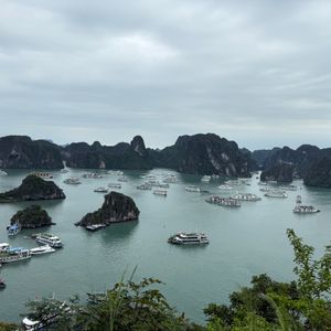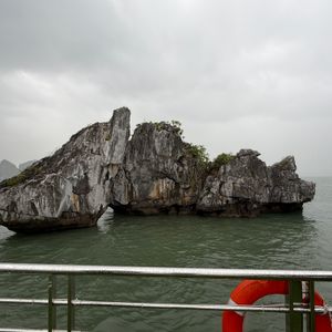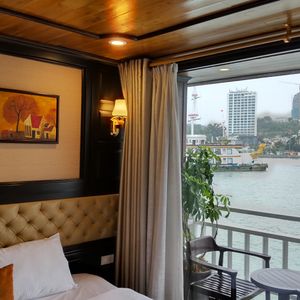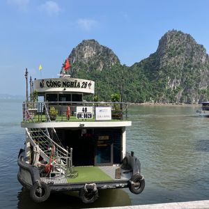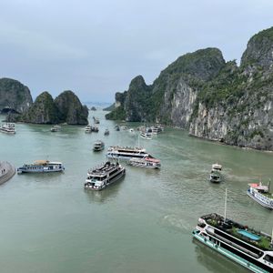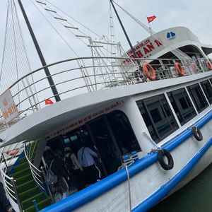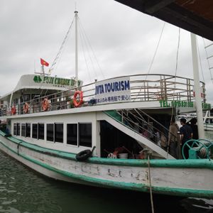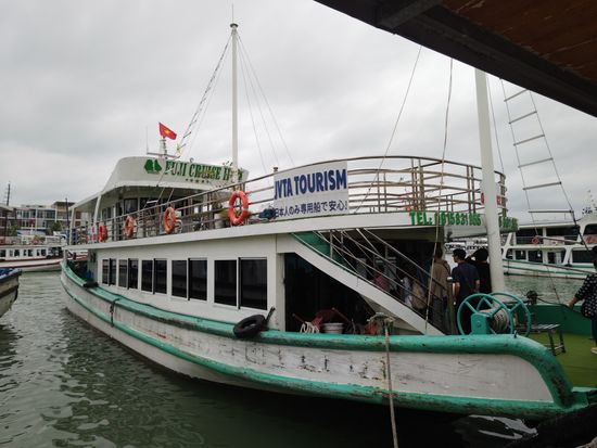 朝8時20分、旧市街にあるホテルにピックアップで、ガイドさんはホテルロビーにいて、ホテルフロントの方と話をされていました。ハノイを出発する際、雨が降っていましたが、ハロン湾付近に着くと、雨が止んでおり、快晴とはいきませんでしたが、涼しい気候のところきれいなハロン湾クルーズを楽しめました。ハノイからハロン湾のクルーズが出る港まで2.5時間くらいのバス移動ですが、大きめのシートで乗り心地が良かったです。ただし、最後尾座席は床が急激に上がっており、乗り心地が悪そうでした。座席に携帯用USB電源がありましたので、スマホの充電ができました。移動途中、お手洗い休憩で寄ったのは土産店で、復路では寄らないので、こちらでベトナムの定番土産のコーヒーやお茶を試飲して、購入しました。港では日本人専用のクルーズ船に乗り換え、出航後、昼食を食べました。種類豊富なベトナム料理でおいしかったです。注意事項に書いてある通り、ペットボトルをクルーズ船に持ち込めません。一部の方は水筒を持参していましたが、ちょっとした水分補給をしたい場合、水筒を持ち込むと良いかもしれません。クルーズ船から各観光地を出発後、ドリンクの販売があり、別料金でビール(4万VND)、ソフトドリンク(3万VND)を購入して飲みました。ハロン湾到着後、スンソット鍾乳洞、シーカヤックまたは手漕ぎ舟で遊覧、ティートップ島の順で下船して楽しみました。ガイドさんは各観光地で快く記念撮影に応じてくれました。また、日本語堪能で話がおもしろかったです。スンソット鍾乳洞では一方通行で階段を上り下りします。遊覧する際、乗り場まで歩きました。島では展望台へ行くまで急な階段を登りました。各見学地では歩きますので、履きなれた靴で参加することをおすすめします。スンソット鍾乳洞はとても大きくて横幅も広かったです。種々の形の岩があり、大きくてきれいな岩があるところでした。スンソット鍾乳洞に入る前に階段を上るのですが、そこからのハロン湾の景色が岩山がたくさん見えて、たくさんの船が停泊していてとても美しかったです。船頭による手漕ぎ舟を選択しましたが、2組ほどシーカヤックに挑戦していました。出発して自力で洞窟の突き当りまで行き、戻ってくるのが大変そうでしたが、女性の参加者も挑戦していて驚きました。ガガーリンの次に宇宙へ行った英雄の宇宙飛行士、ゲルマン・チトフさんの名前にちなんで名付けられたティートップ島では展望台まで行き、島からのハロン湾の景色を楽しみ、ビーチを散策しました。ティートップ島を見学後、サービスでフルーツ、スナック、コーヒー、お茶、ワインの中から選択できワインをいただきました。島から港に戻る前、クルーズ船を止めて船上から見どころの岩を見学、記念撮影をしました。復路はお手洗い休憩を兼ねてサービスエリアに寄り、併設されたフードコートのようなところでフォーを食べましが、おいしかったです。ツアー終了後、通常、宿泊先のホテルまで送っていただけますが、途中のトレインストリートでドロップオフできるのも良い点でした。バスを下車して20分後くらいに列車を見ることができました。