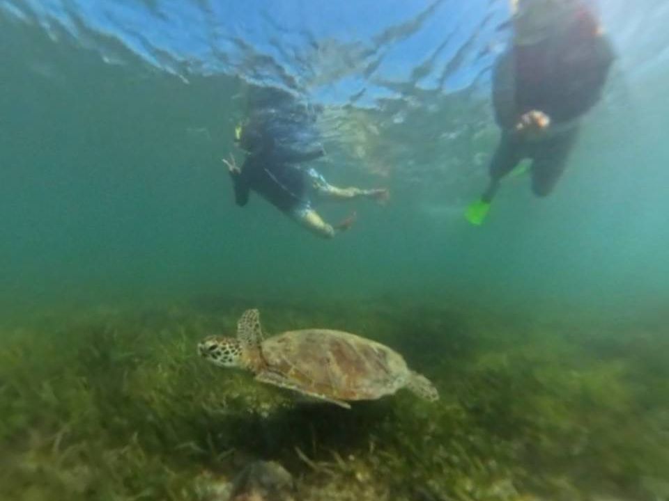桟橋の下あたりをシュノーケリングで探索していると、本当にウミガメに出会えました!